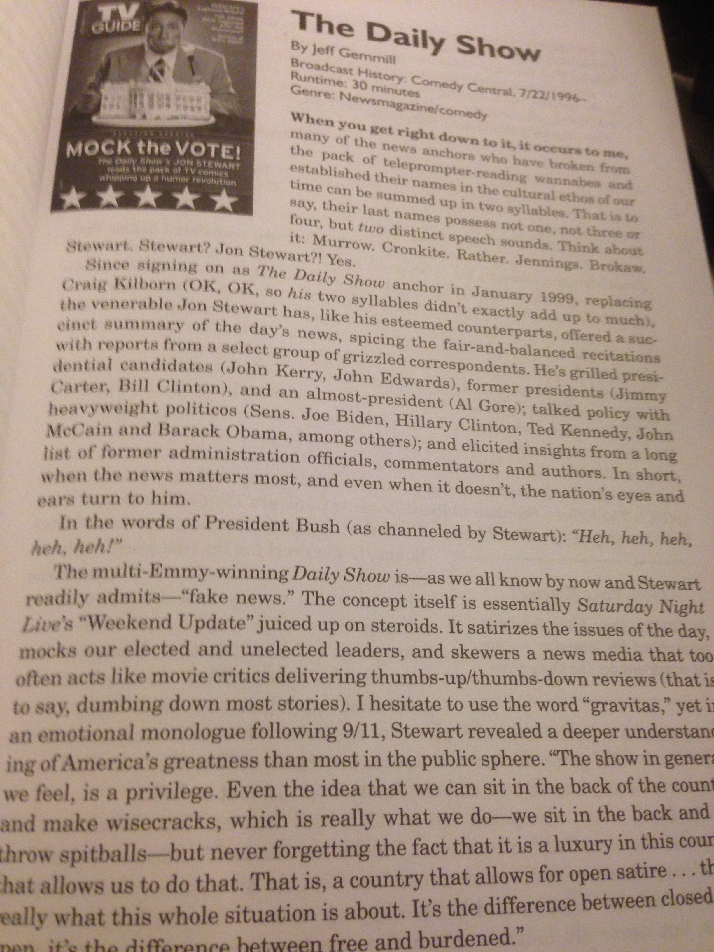 For quite a few years in the 2000s, Diane and I stayed up late during the week to watch The Daily Show and, once it premiered, The Colbert Report. It was the funniest hour on TV. So I was thrilled to write about Stewart’s satirical shindig (and mention Colbert) for a TV GUIDE project about “100 essential shows” that came to be known as I Heart TV, published by Sasquatch Books in 2007. (I also contributed essays on three of my other favorites, My So-Called Life, The Tonight Show Starring Johnny Carson and The Wonder Years.)