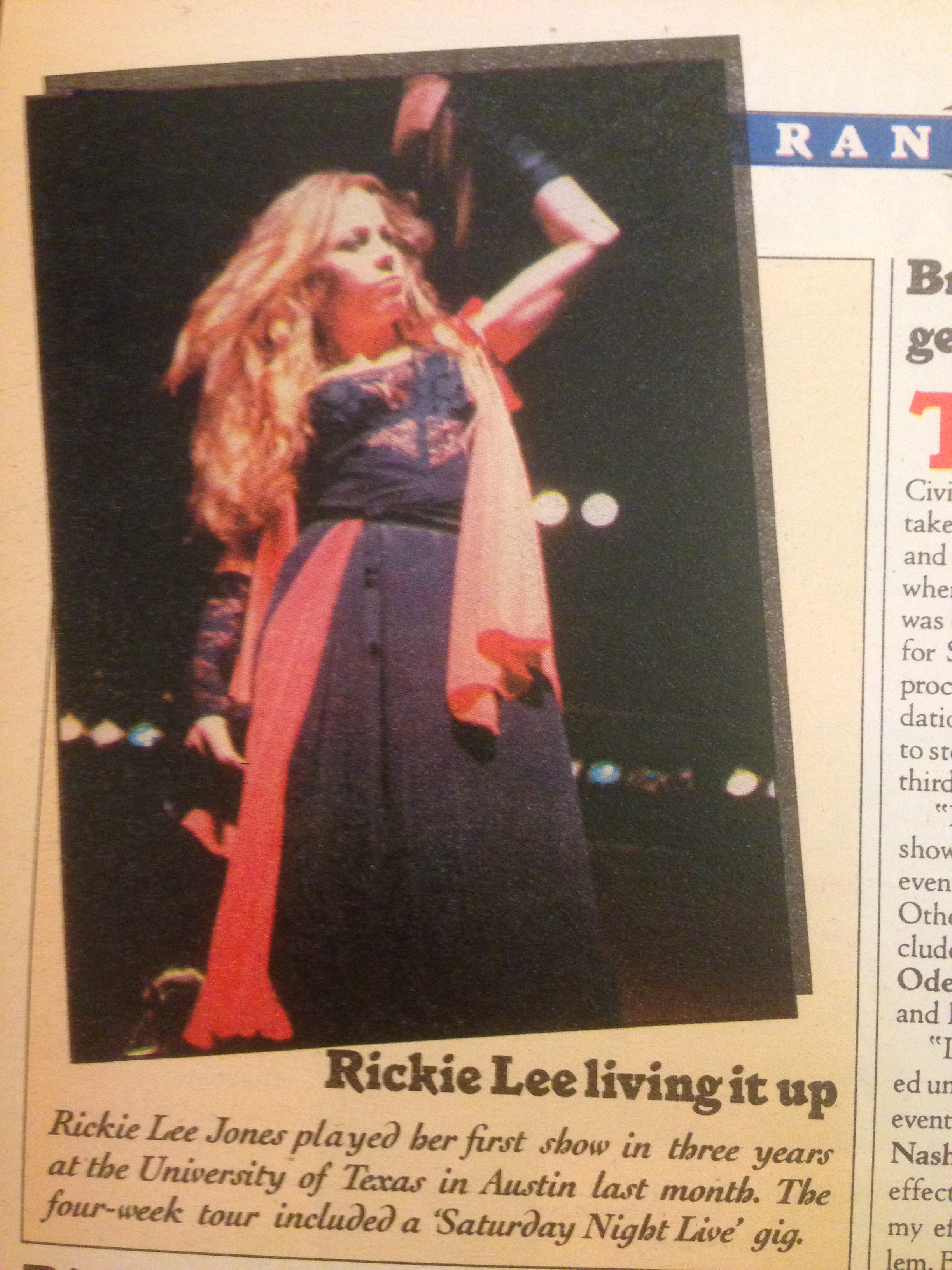 2) Rickie Lee Jones – “Woody and Dutch on the Slow Train to Peking.” In July 1981, Rickie Lee released the follow-up to her classic 1979 self-titled debut: the equally classic Pirates, which is home to “We Belong Together” and this song, among others. She didn’t tour in support of the album, however, until early 1982, as this Random Notes mention indicates.