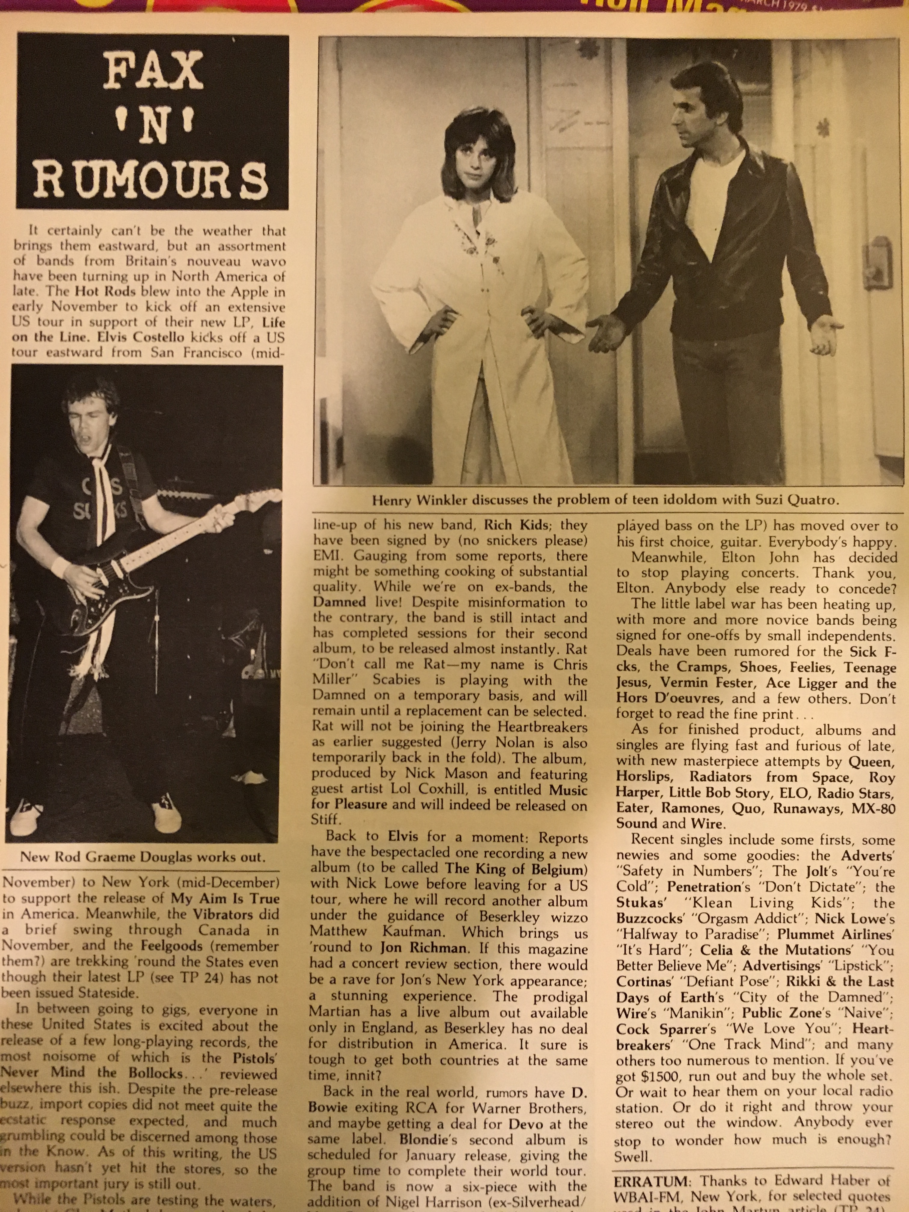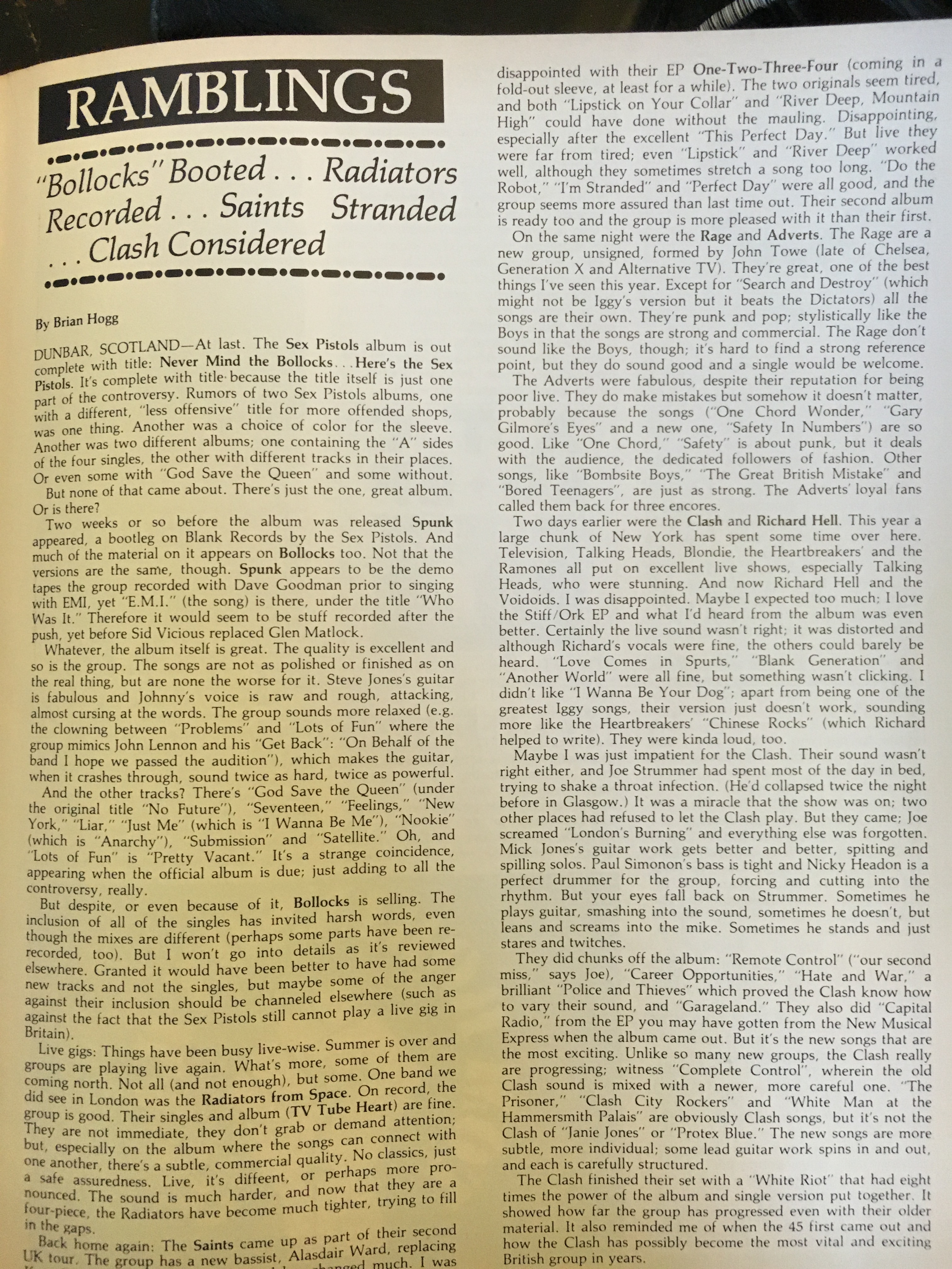 5) The Clash – “White Riot.” In Brian Hoggs’ “Ramblings” column, he mentions/reviews a Clash concert. “…Joe Strummer had spent most of the day in bed, trying to shake a throat infection. (He’d collapsed twice the night before in Glasgow.) It was a miracle that the show was on; two other places had refused to let the Clash play. But they came; Joe screamed ‘London’s Burning’ and everything else was forgotten. Mick Jones’s guitar work gets better and better, spitting and spilling solos. Paul Simonon’s bass is tight and Nicky Headon is a perfect drummer for the group, forcing and cutting into the rhythm. But your eyes fall back on Strummer. Sometimes he plays guitar, smashing into the sound, sometimes he doesn’t, but leans and screams into the mike. Sometimes he stands just stares and twinkles.”
