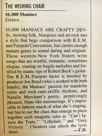 2) 10,000 Maniacs – “Scorpio Rising.” The major-label debut of 10,000 Maniacs, The Wishing Chair, is reviewed in this issue. Critic Ted Drozdowski writes: “10,000 Maniacs are crafty devils, stewing folk, bluegrass and art rock into a style that begs comparison with R.E.M. and Fairport Convention, but carries enough mutant genes to sound daring and original. These western-New York Staters write songs that are wistful, romantic, sometimes elegiac, soaring on fragile melodies and fortified by manic rips of Robert Buck’s guitar.”