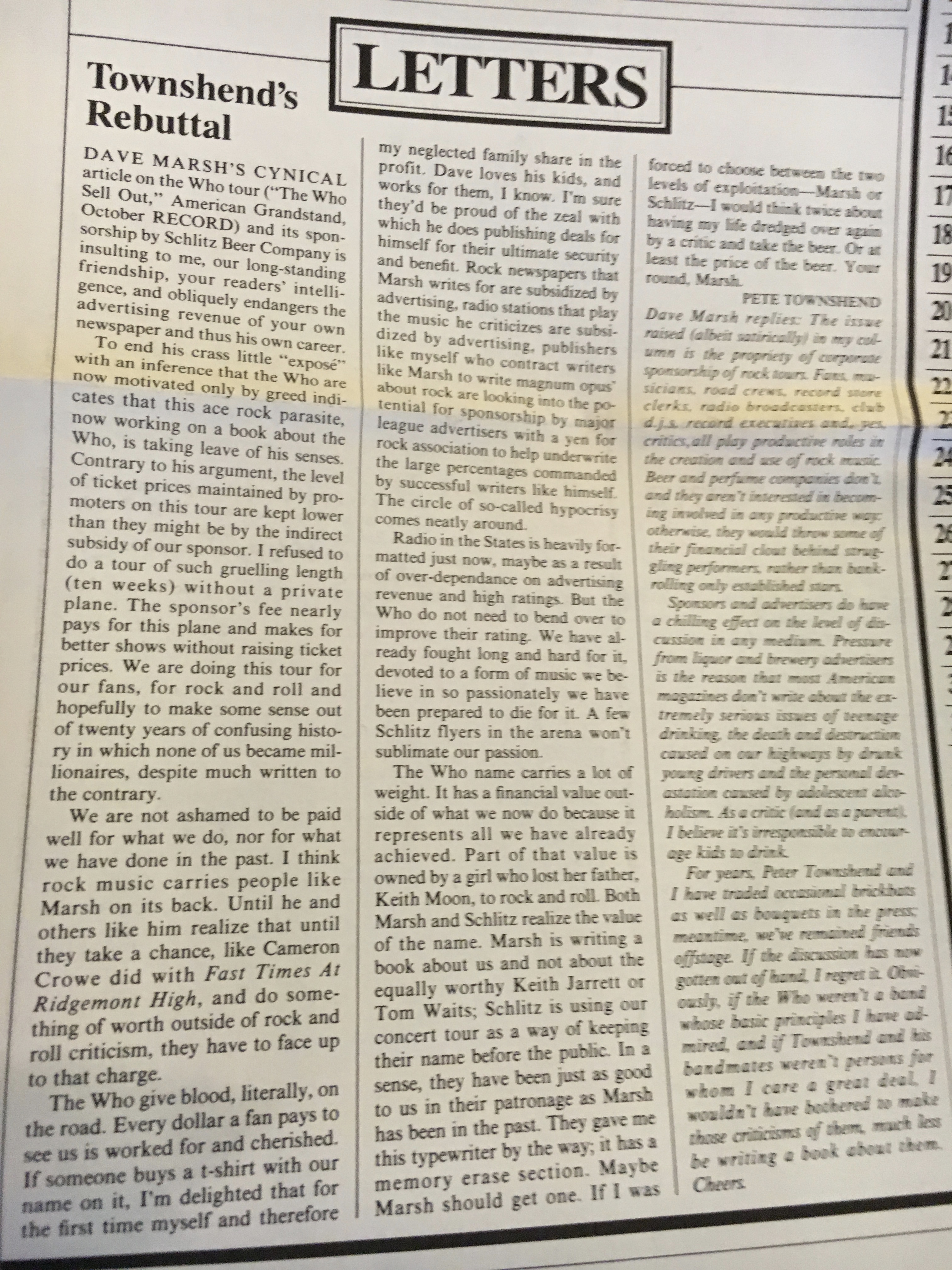 He’s more his sharp-edged self in a letter to the editor, chiding Dave Marsh for taking the Who to task for their sponsorship deal with Schlitz Beer in his October “American Grandstand” column: “To end his crass little ‘expose’ with an inference that the Who are now motivated only be greed indicates that this ace rock parasite, now working on a book about the Who, is taking leave of his senses.” Later, after reminding all of the weight the Who name carries, he notes that “Marsh is writing a book about us and not about the equally worthy Keith Jarrett or Tom Waits, Schlitz is using our concert tour as a way of keeping their name before the public. In a sense, they have been just as good to us in their patronage as Marsh has been in the past. They gave me this typewriter by the way; it has a memory erase section. Maybe Marsh should get one. If I was forced to choose between the two levels of exploitation—Marsh or Schlitz—I would think twice about having my life dredged over again by a critic and take the beer. Or at least the price of the beer.”
