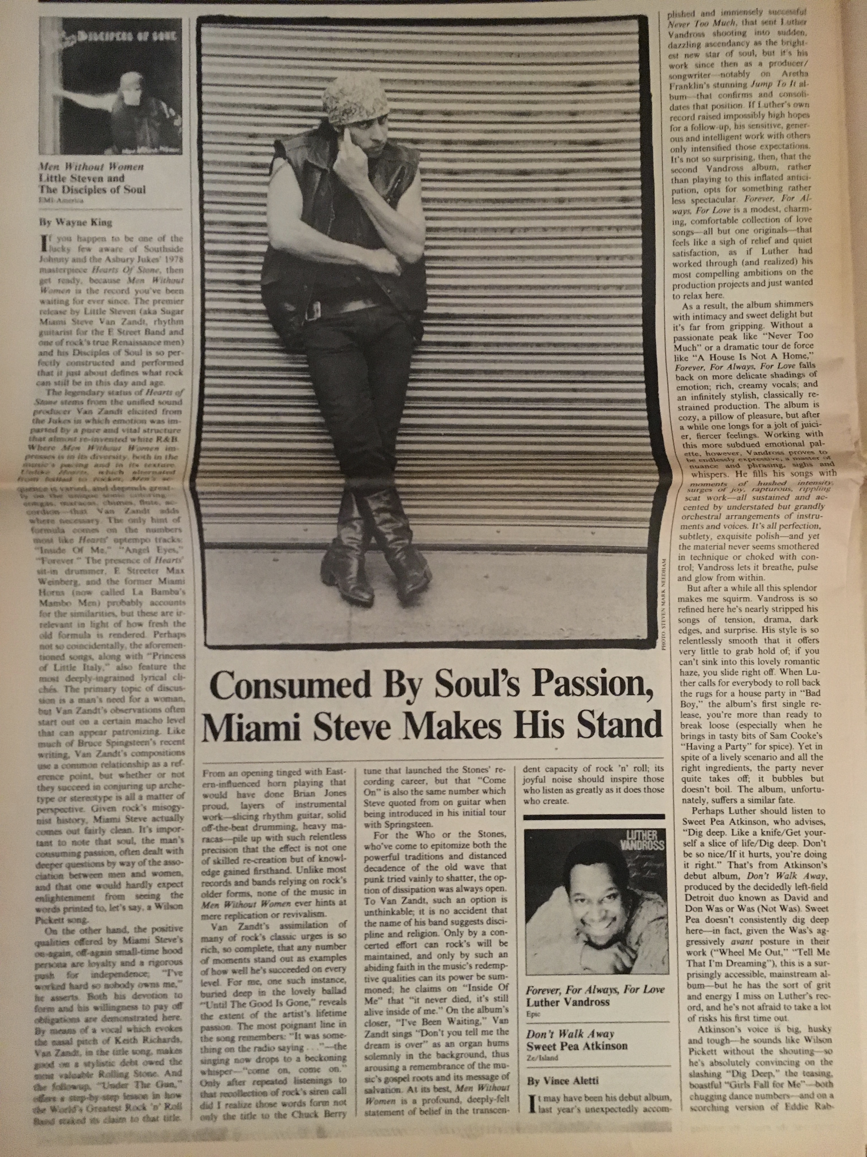 3) Little Steven and the Disciples of Soul – “Men Without Women.” Wayne King reviews longtime Springsteen sideman Steven Van Zandt’s debut LP, of which this is the title tune. Van Zandt’s vocal, he says, “evokes the nasal pitch of Keith Richards”; and the album, as a whole, “is a profound, deeply-felt statement of belief in the transcendent capacity of rock ’n’ roll; its joyful noise should inspire those who listen as greatly as it does those who create.”