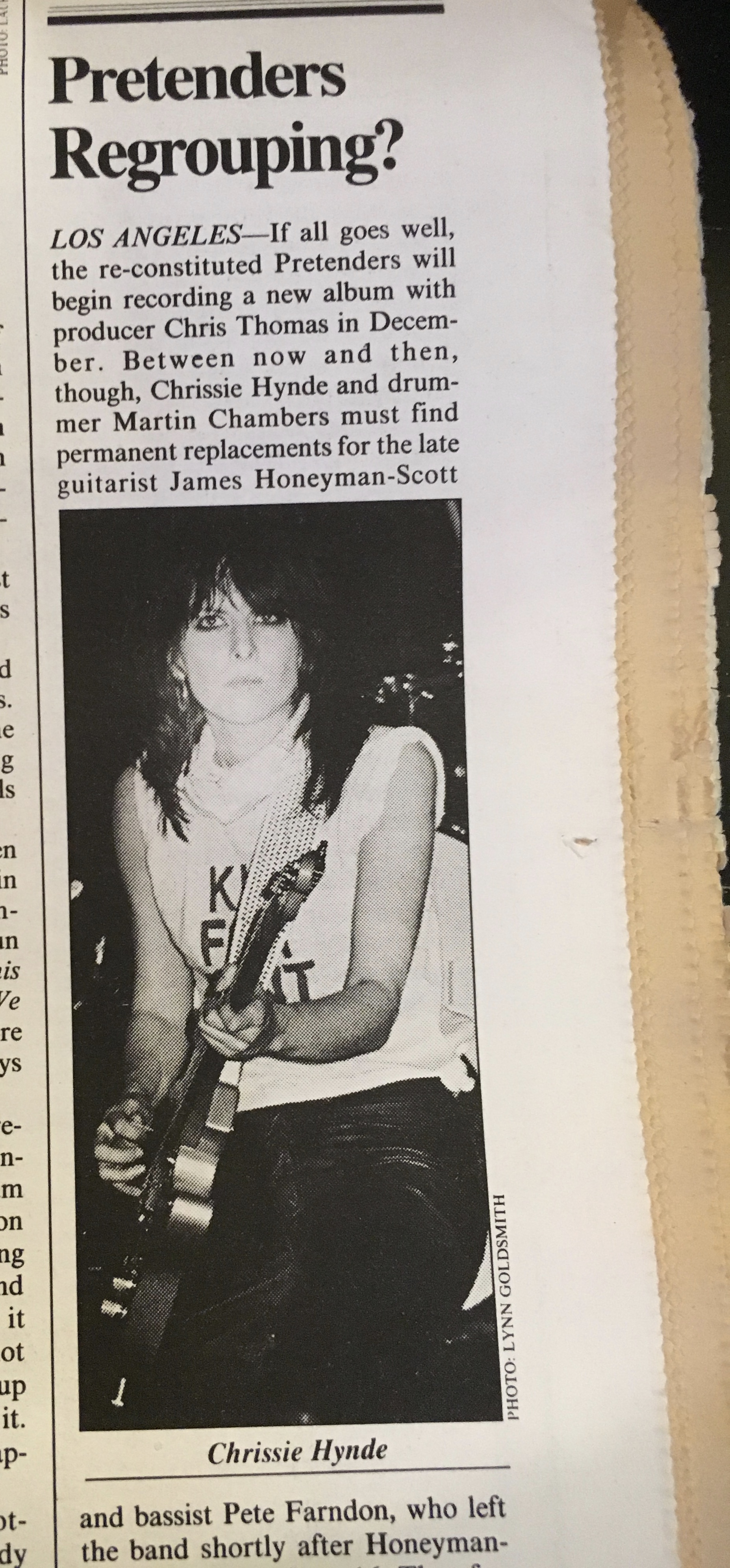 2) The Pretenders – “My City Was Gone.” There’s a brief article by Suzanne Whatley on Chrissie Hynde and Martin Chambers, who were seeking permanent replacements for the late James Honeyman-Scott, who o.d.ed, and Pete Farndon, who – according to the article – split from the band after Honeyman-Scott’s death in June 1982. (He o.d.ed himself in April 1983.) The article states that “Hynde and Chambers cut a single, ‘Back on the Chain Gang,’ which has been released in England on the Real label. Accompanying the two Pretenders in the studio were guitarist Billy Bremner, late of Rockpile, and bassist Tony Butler, who played on Pete Townshend’s Chinese Eyes LP.”