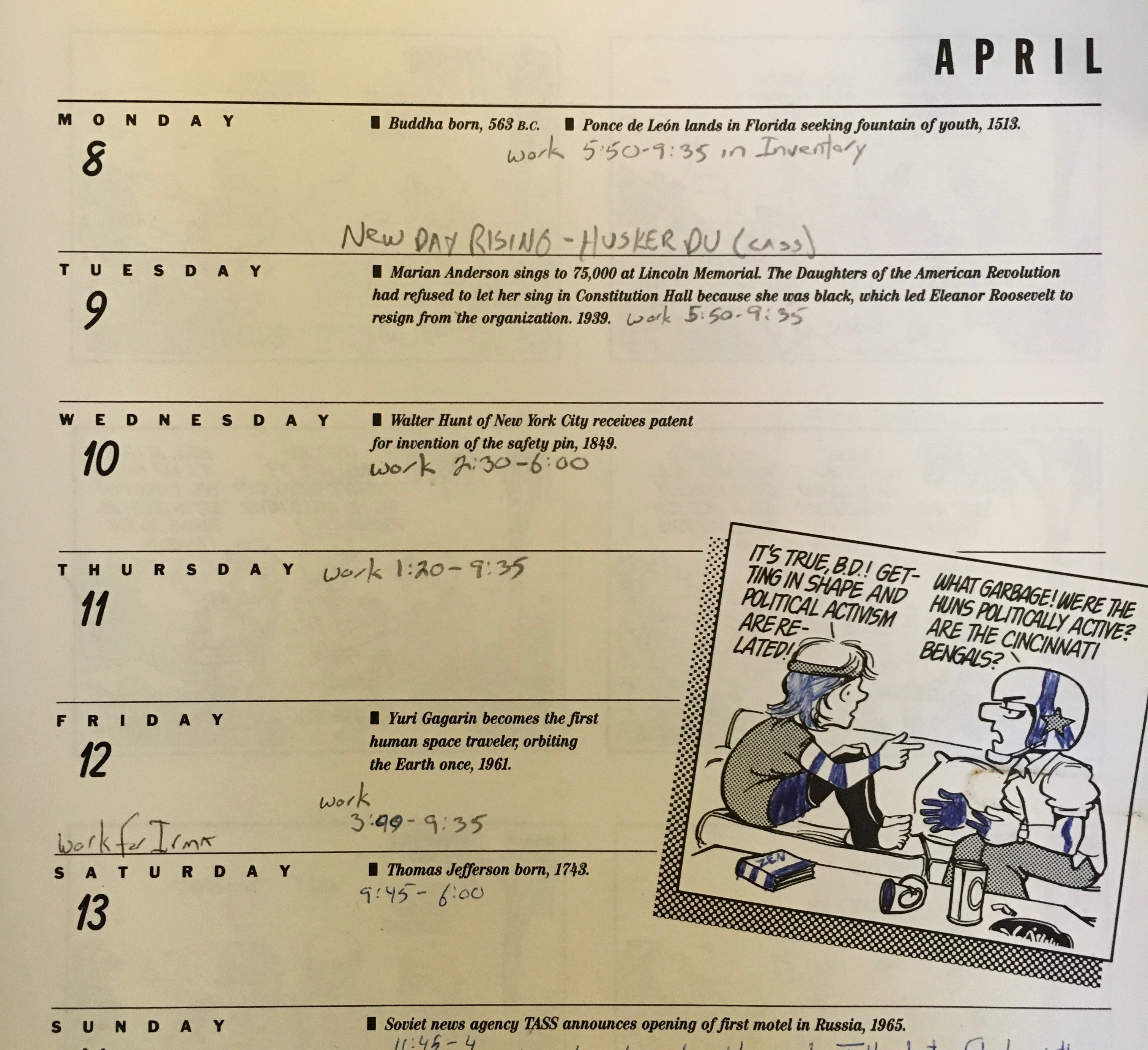 First, though: I was a few months shy of turning 20, a college sophomore attending one of Penn State’s satellite campuses while living at home. I worked part-time at a department store, though “part-time” is a bit of a misnomer. I often put in more than my scheduled 16-20 hours (Tuesday and Thursday nights, Saturdays and/or Sundays); the week of the 8th, for instance, I clocked 38 hours, though a large chunk of that was due to helping with inventory. The week prior, I worked 26 hours in total. I say so with certainty not because I possess total recall, which I’m glad I don’t, but my desk calendar, where I often tracked such things. (It’s a habit I wish I’d maintained, but – as I’ve noted elsewhere – I pretty much stopped after I departed for the Penn State mothership in the fall.)