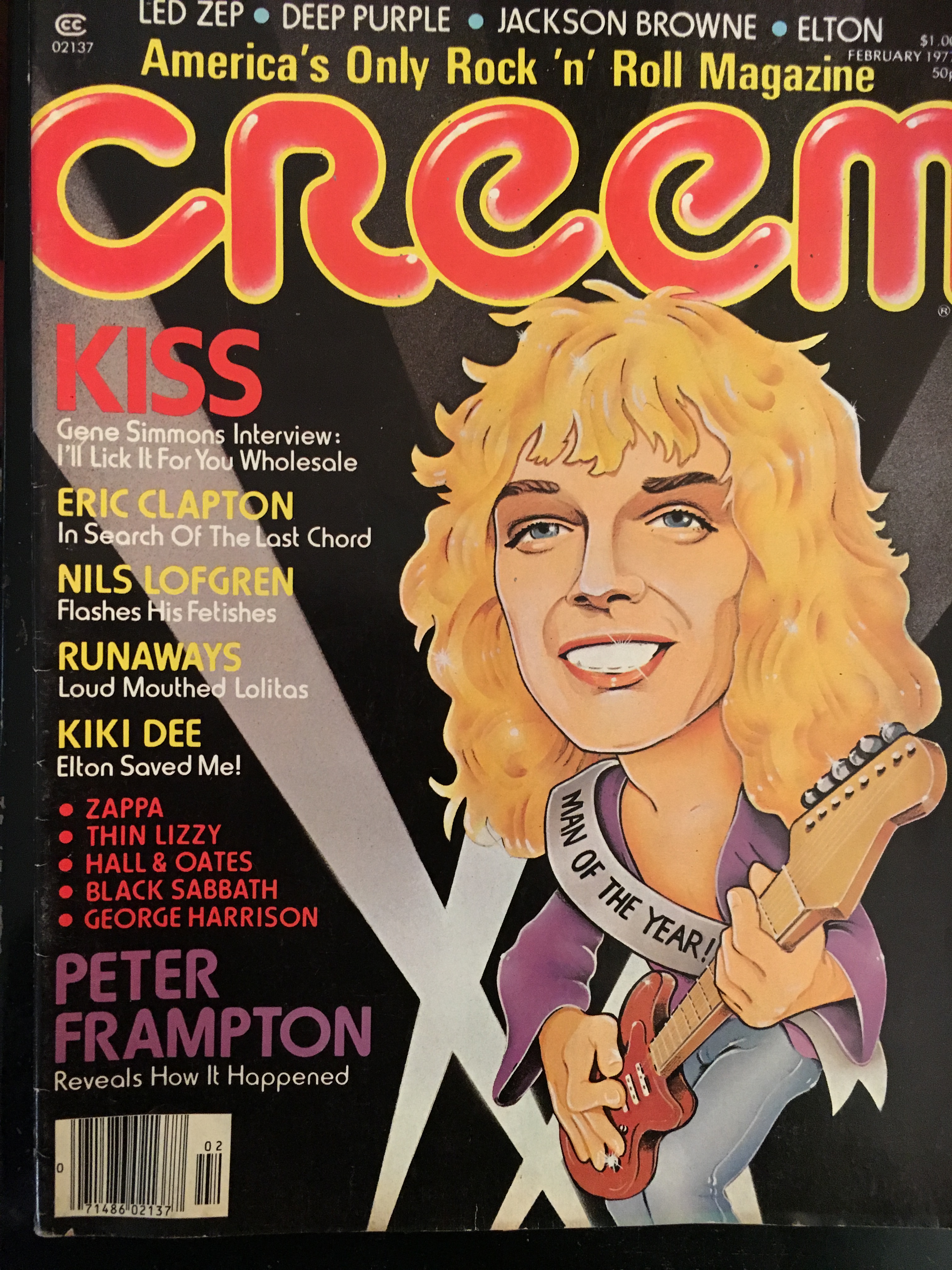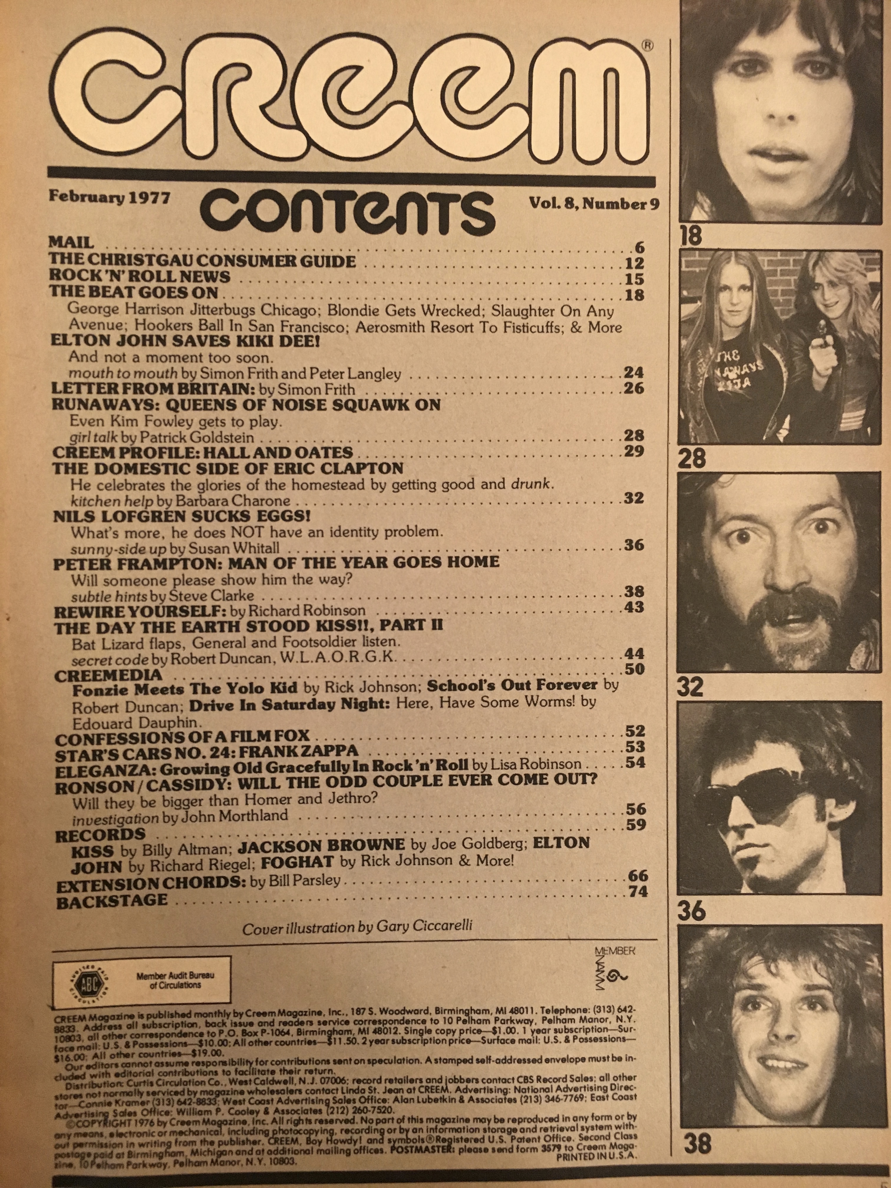 This issue’s cover story, as seen above, is on journeyman Peter Frampton, whose domination of the record charts in 1976 (and transformation from rocker into a teen idol) would be equaled within a few years by his descent into near-anonymity. There are also articles, as the Contents page shows, on Eric Clapton, Nils Lofgren, Kiki Dee, Lou Reed and the Runaways, among others.