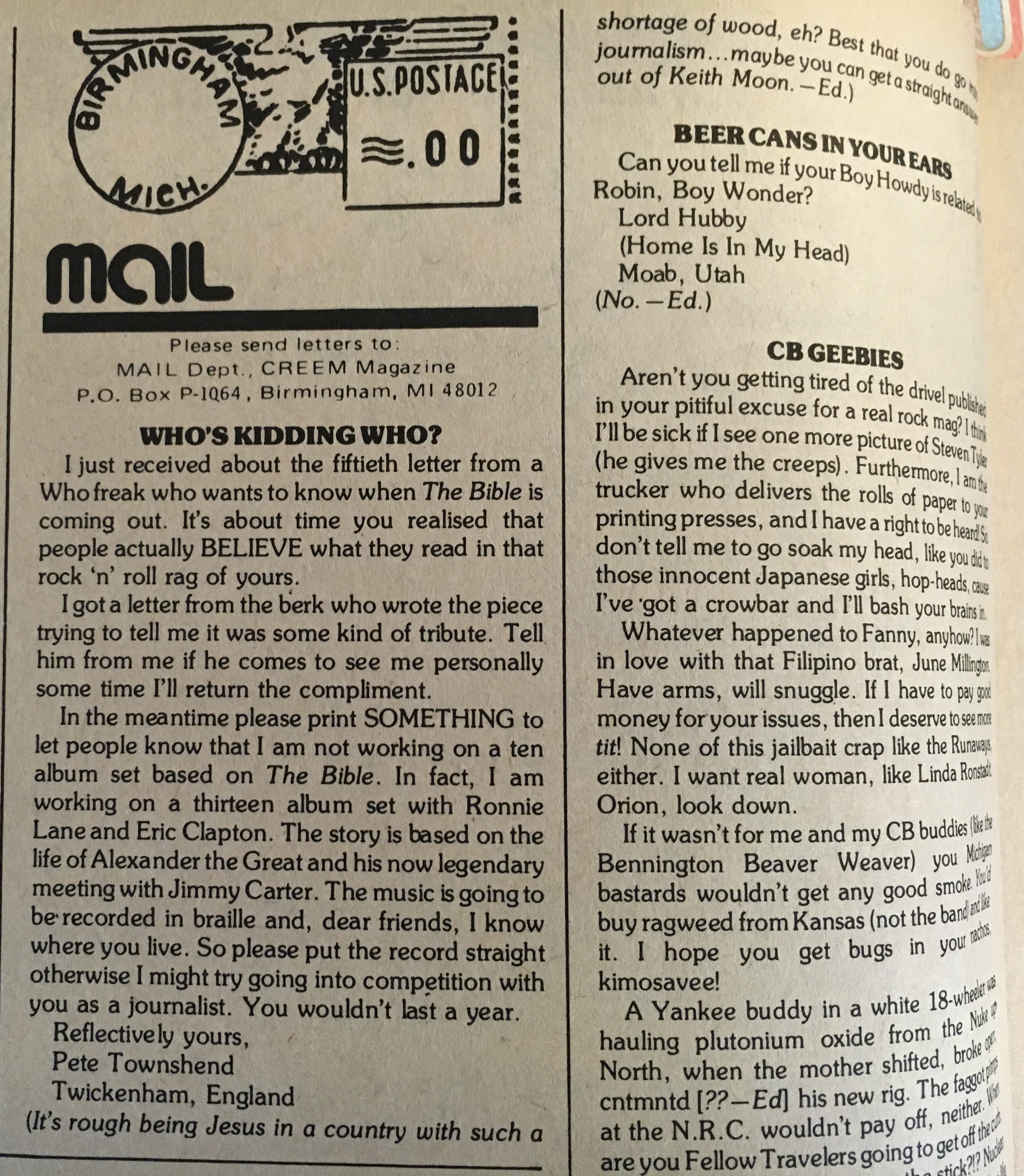 The first thing that grabbed my eye in this Creem: a letter in the Mail section from one Pete Townshend of Twickenham, England, who’s fed up with Creem readers haranguing him about when the Who’s 10-LP set based on the Bible will be released. (A previous issue had included a parody of Pete’s penchant for rock operas.) It’s an echo of the mythical Masked Marauders, of course, and goes to show that, no matter the era, some folks want to be fooled.
