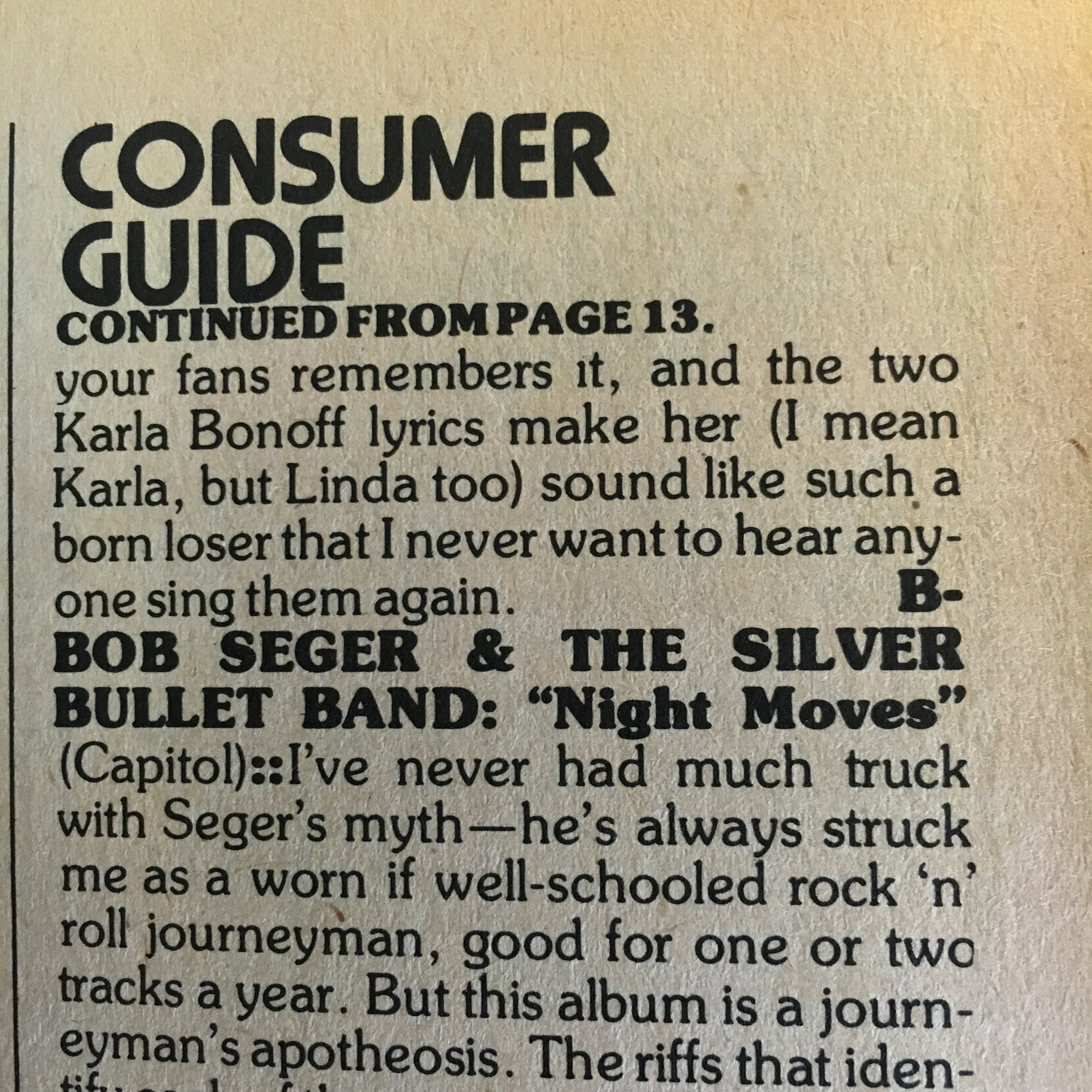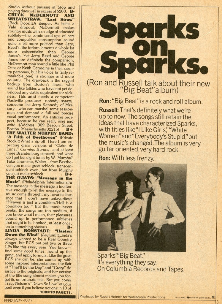 1) Linda Ronstadt – “Lose Again.” Robert Christgau tackles Linda’s seventh solo album, Hasten Down the Wind, which was released in August of the preceding year: “Linda’s always wanted to be a Real Country Singer, but RCS put out two or three LPs like this every year. You know—find some good tunes, round up the gang, and apply formula. Like the great RCS she can be, she comes up with some inspired interpretations; the flair of ‘That’ll Be the Day’ and ‘Crazy’ do justice to the originals, and her version of the title song al