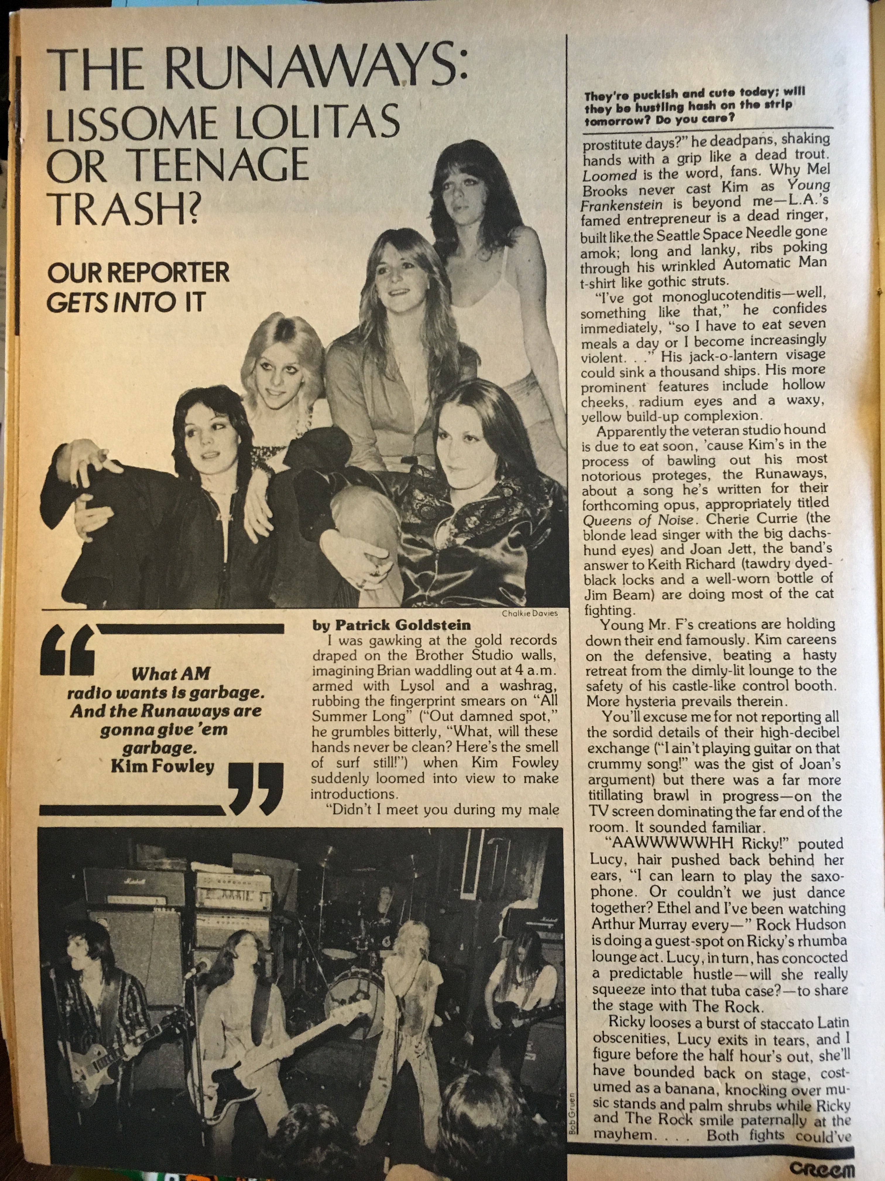 Later, Goldstein goes deep into Fowley’s effort to cast the band as rock ’n’ roll Lolitas, and quotes Cherie Curie as saying, ’This isn’t a tits-and-ass show. When you’re 16, you can’t stand up there and be a sex object. It’s just not part of being 16. I’m not old enough to play Brigitte Bardot or Raquel Welch. Hell, I’m 16.”