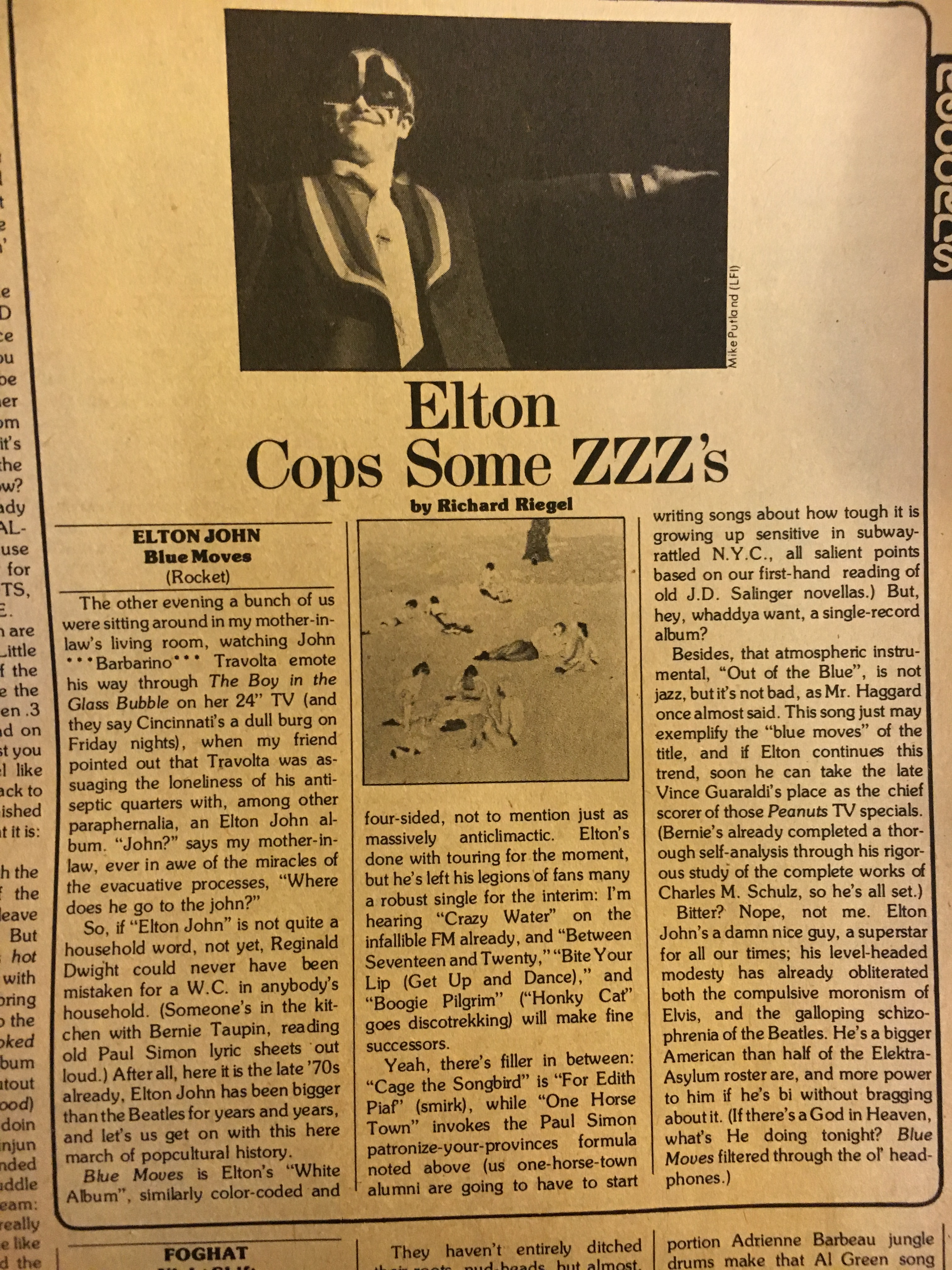 5) Elton John – “Sorry Seems to Be the Hardest Word.” Richard Riegel reviews Elton John’s Blue Moves, a double-LP set released in October 1976, calling it Elton’s “White Album, similarly color-coded and four-sided, not to mention just as anticlimactic.” He points out that there’s filler, including “Cage the Songbird” and “One Horse Town,” and offers up this snarky observation: “[T]hat atmospheric instrumental, ‘Out of the Blue,’ is not jazz, but it’s not bad, as Mr. Haggard once almost said. This song just may exemplify the ‘blue moves’ of the title, and if Elton continues this trend, soon he can take the late Vince Guaraldi’s place as the chief scorer of those Peanuts TV specials. (Bernie’s already completed a thorough self-analysis through his rigorous study of the complete works of Charles M. Schulz, so he’s all set.)”