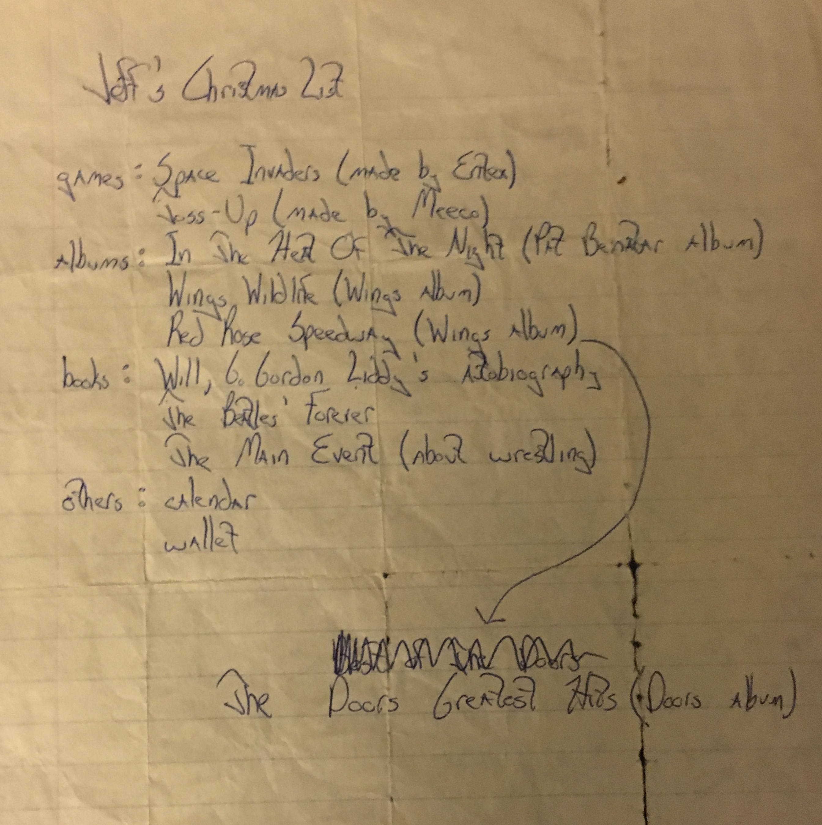 It consisted, as the above picture shows, of two hand-held video games, neither of which I received; four LPs, three of which I did; three books, of which I received all; a calendar; and a wallet. (I also received, as always, clothes and stuff.)