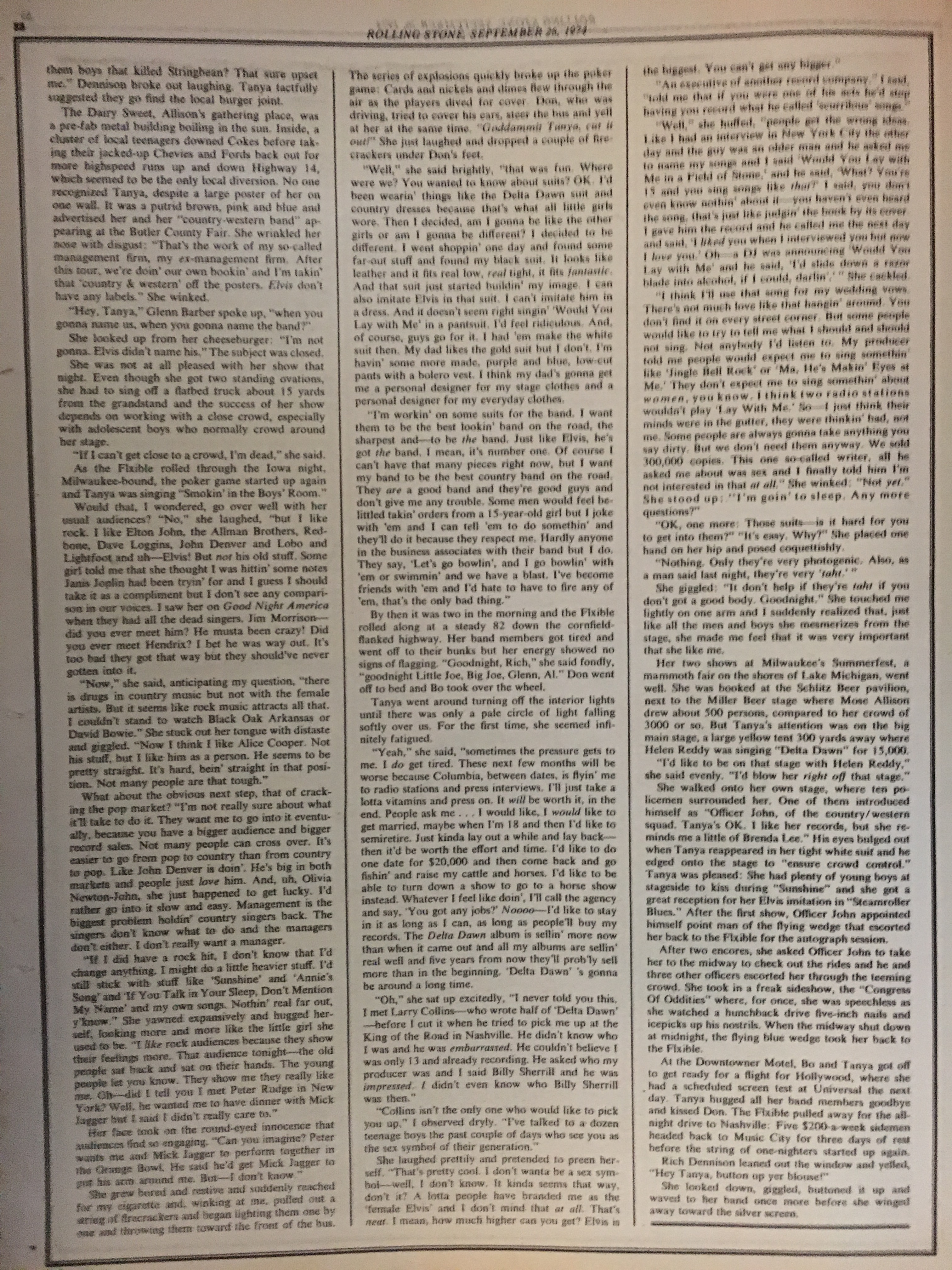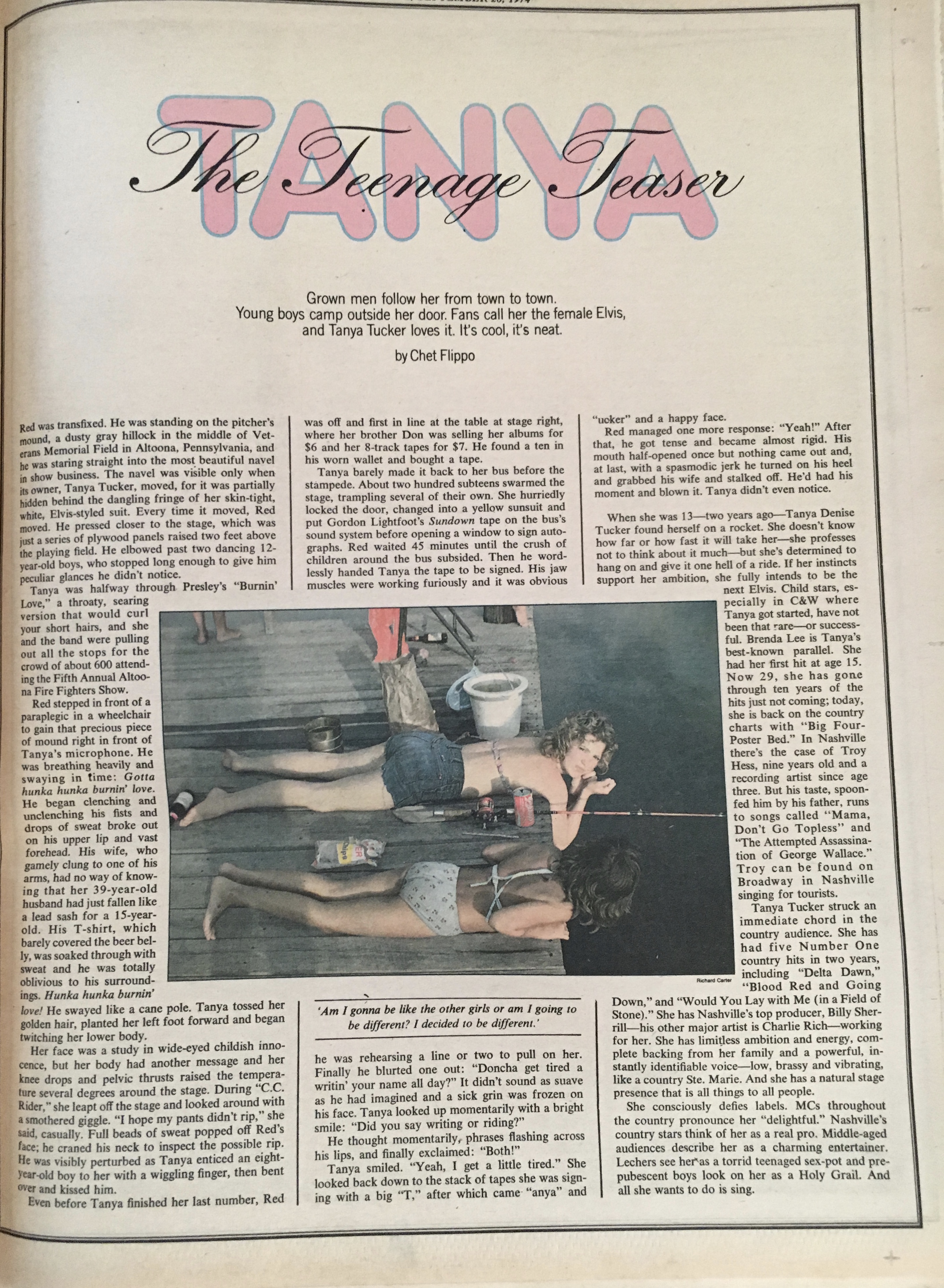 Titled “Tanya, the Teenage Teaser,” the Chet Flippo-written profile catches up with Tucker at the Fifth Annual Altoona Fire Fighters Show in Altoona, Pa., where her rendition of Elvis Presley’s “Burning Love” apparently sparked flames of lust in the male folk. “Her face was a study in wide-eyed childish innocence, but her body had another message and her knee drops and pelvic thrusts raised the temperature several degrees around the stage,” Flippo writes.