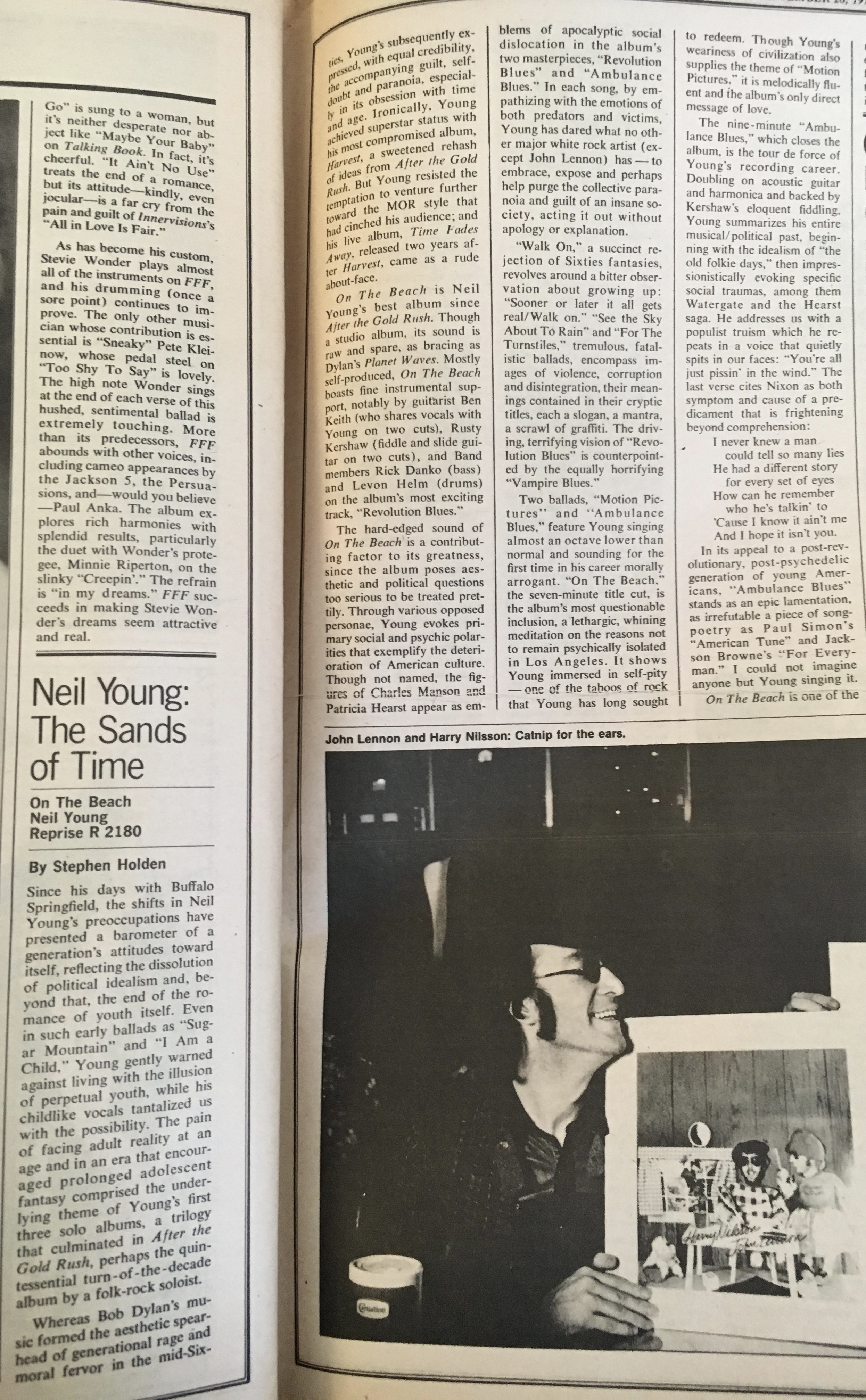 3) Neil Young – “Revolution Blues.” Stephen Holden tackles Neil’s classic On the Beach: “The hard-edged sound of On the Beach is a contributing factor to its greatness, since the album poses aesthetic and political questions too serious to be treated prettily. Through various opposed personae, Young evokes primary social and psychic polarities that exemplify the deterioration of American culture. Though not named, the figures of Charles Manson and Patricia Hearst appear as emblems of apocalyptic social dislocation in the album’s two masterpieces, ‘Revolution Blues’ and ‘Ambulance Blues.’ In each song, by empathizing with the emotions of both predators and victims, Young has dared what no other major white rock artist (except John Lennon) has—to embrace, expose and perhaps help purge the collective paranoia and guilt of an insane society, acting it out without apology or explanation.”