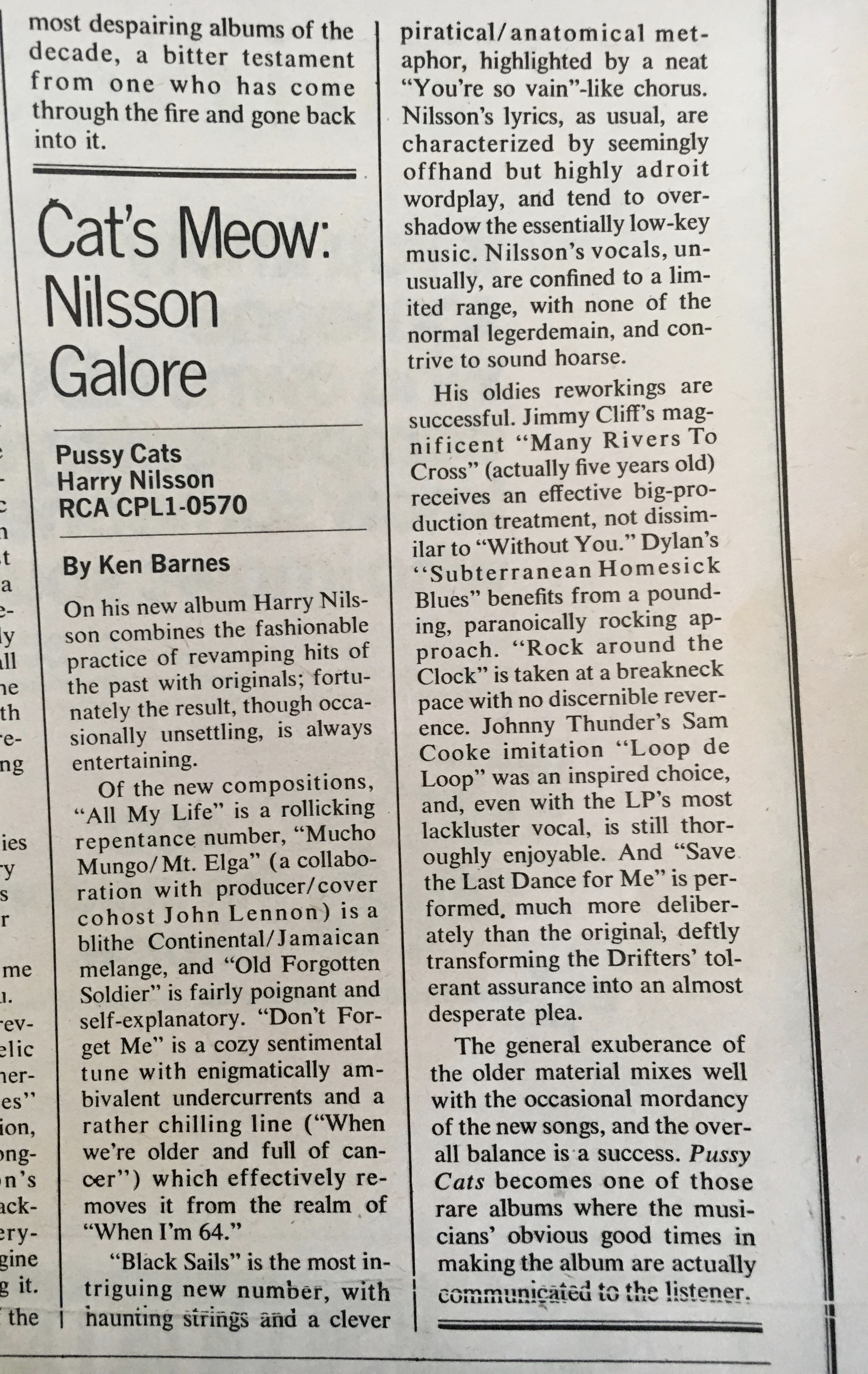 4) Harry Nilsson – “Black Sails.” Ken Barnes says of Pussy Cats: “On his new album Harry Nilsson combines the fashionable practice of revamping hits of the past with originals; fortunately the result, though occasionally unsettling, is always entertaining.” He calls this song “the most intriguing new number, with haunting strings and a clever piratical/anatomical metaphor, highlighted by a neat ‘You’re so vain’-like chorus. Nilsson’s lyrics, as usual, are characterized by seemingly offhand but highly adroit wordplay, and tend to overshadow the essentially low-key music. Nilsson’s vocals, unusually, are confined to a limited range, with none of the normal legerdemain, and contrive to sound hoarse.”