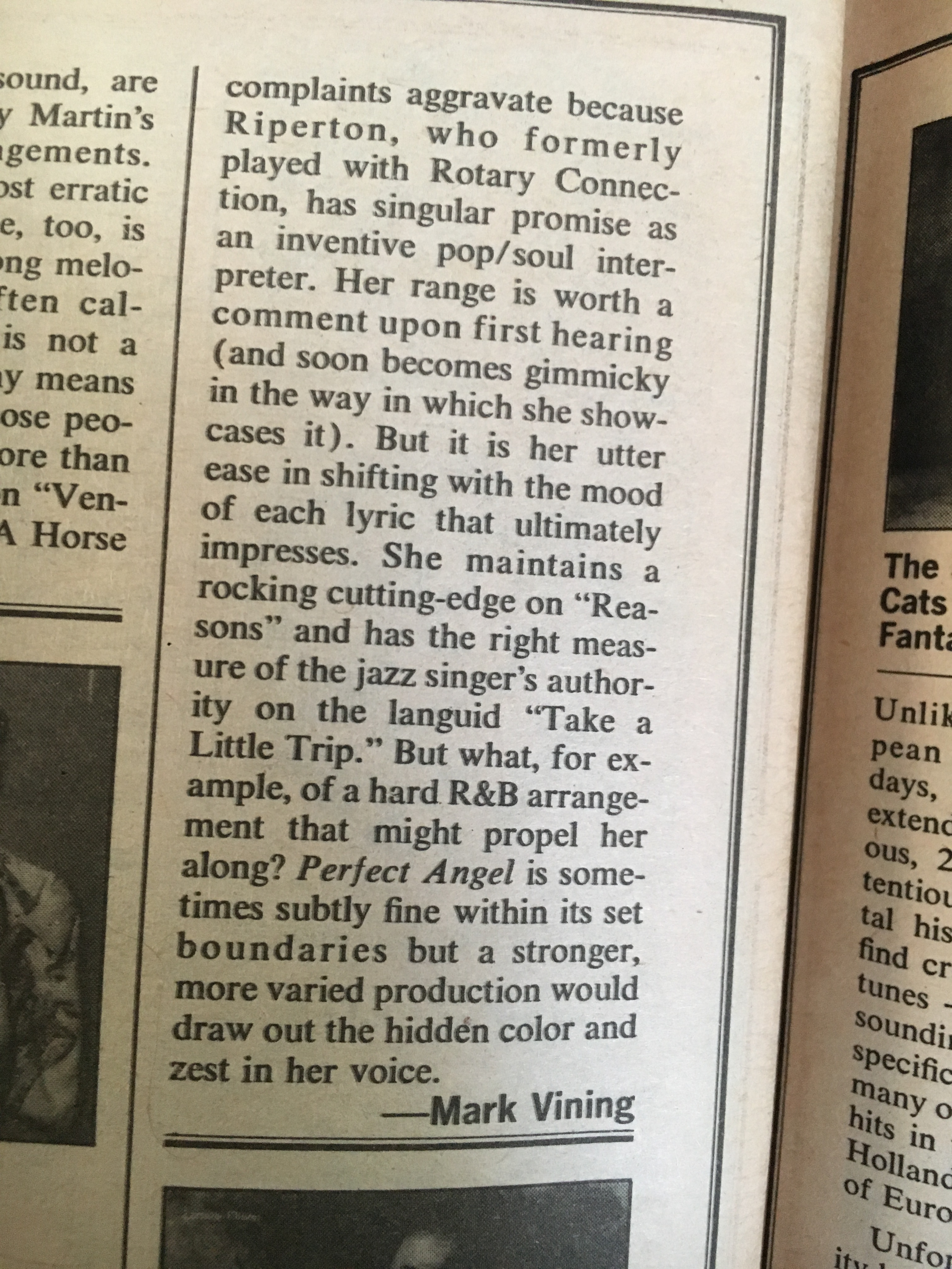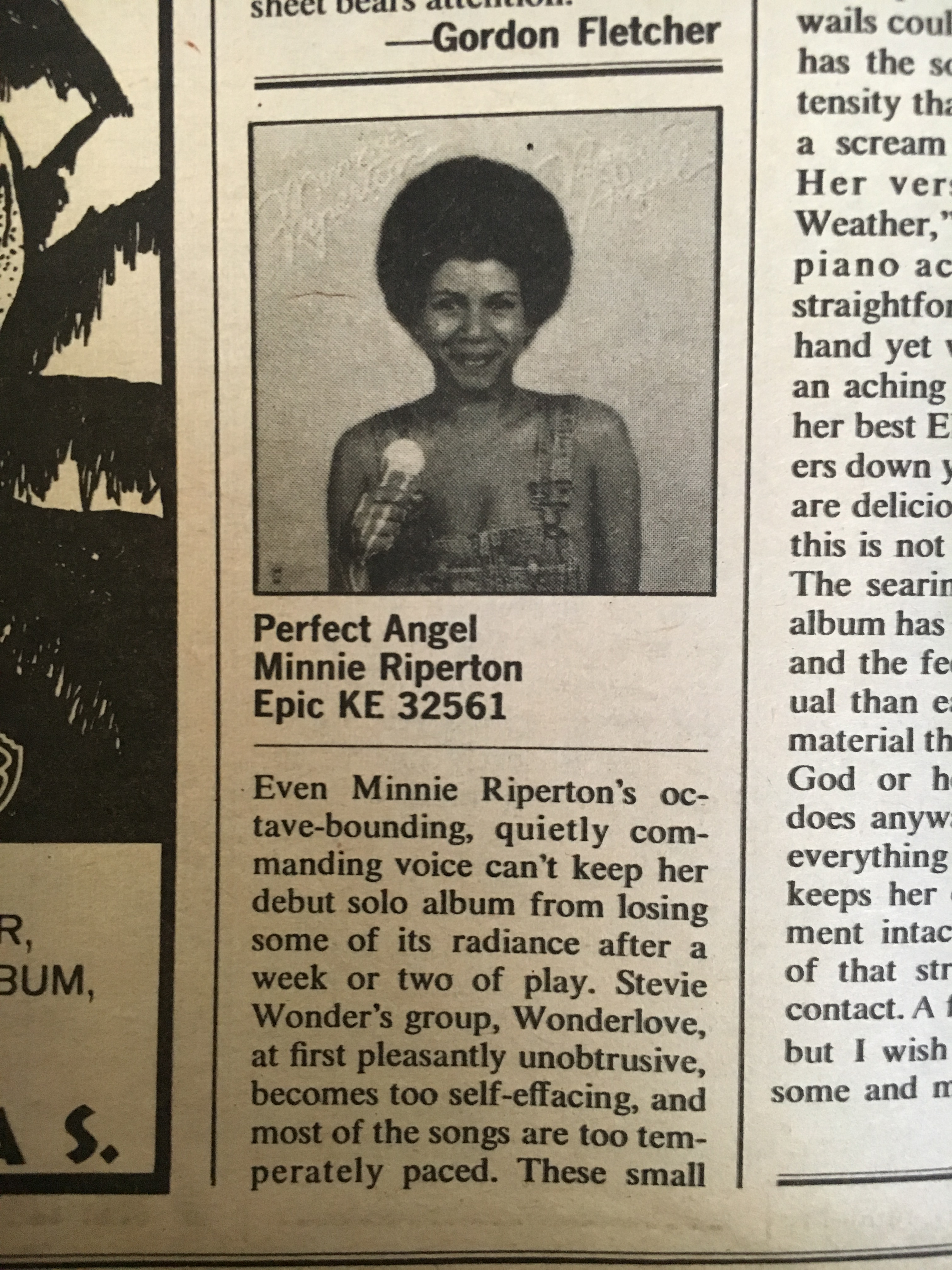 5) Minnie Riperton – “Lovin’ You.” Believe it or not, but Mark Vining never mentions the classic “Lovin’ You” in his review of Riperton’s second album, Perfect Angel, which he mistakes for her debut (which was actually Come to My Garden in 1970): “Even Minnie Riperton’s octave-bounding, quietly commanding voice can’t keep her debut solo album from losing some of its radiance after a week or two of play.” He concludes with: “Perfect Angel is sometimes subtly fine within its set boundaries but a stronger, more varied production would draw out the hidden color and zest in her voice.”