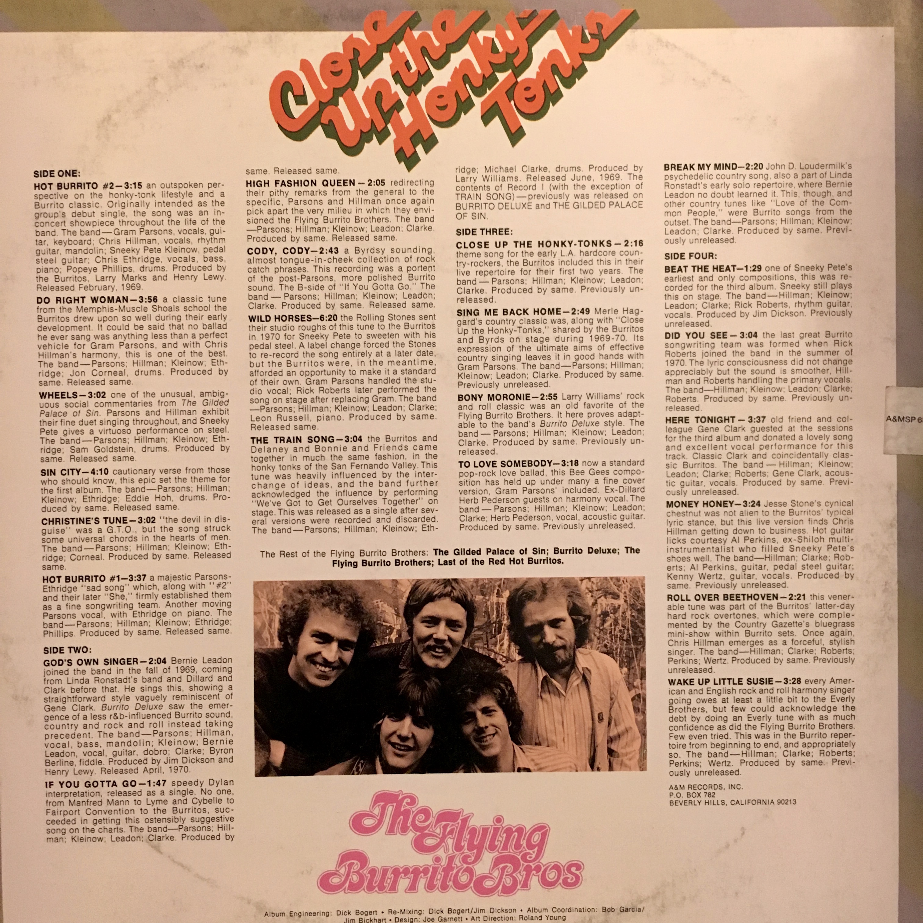 The first Flying Burrito Brothers album I purchased, on April 27, 1984, was the two-LP Close Up the Honky Tonks compilation that covered the band’s prime 1968-72 years. It collected tracks from their first two albums with Gram Parsons, b-sides and a few rarities. The fourth side featured songs from the post-Parsons era of the band – though, oddly, nothing from their first post-Parsons album. But I enjoyed that material so much that, a few days later, I picked up their self-titled third album, which was originally released in June 1971.