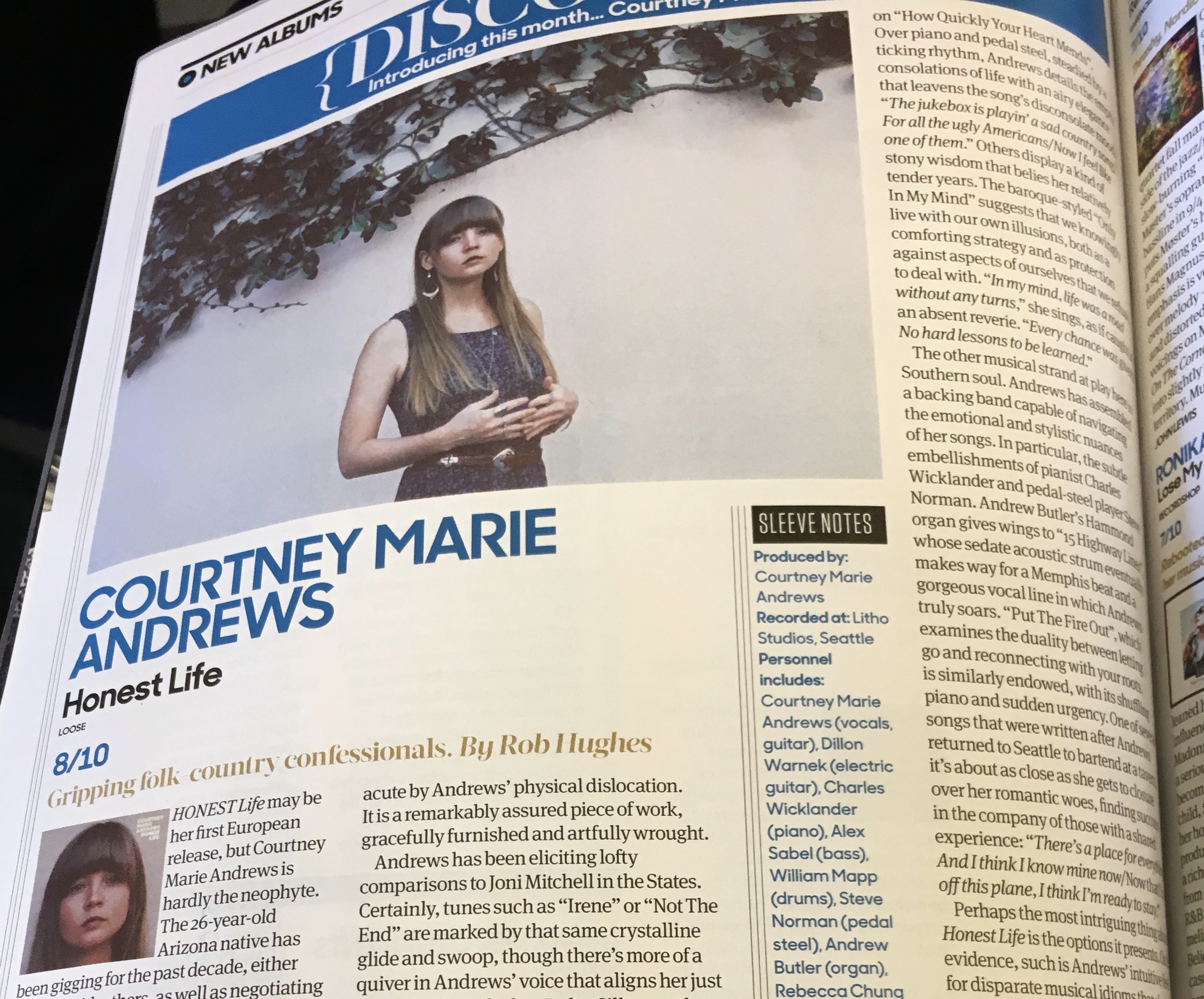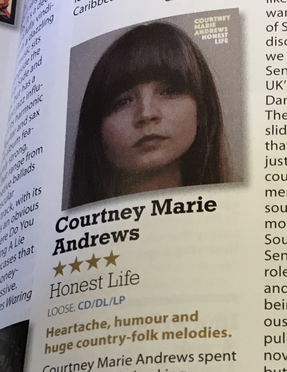 As a result, through the years (decades?) of such excursions, I’ve discovered much good music from both magazines – including, yesterday, Courtney Marie Andrews. She’s a 26-year-old, Arizona-born singer-songwriter who now lives outside of Seattle. Uncut referenced Joni Mitchell, Judee Sill and Emmylou Harris in its review of her recent album, Honest Life; Mojo just mentions Joni. Such lofty comparisons seem a tad unfair, but such is the shorthand used by most music fans, including myself. I’d add two more: Klara Söderberg of First Aid Kit; and Iris DeMent.