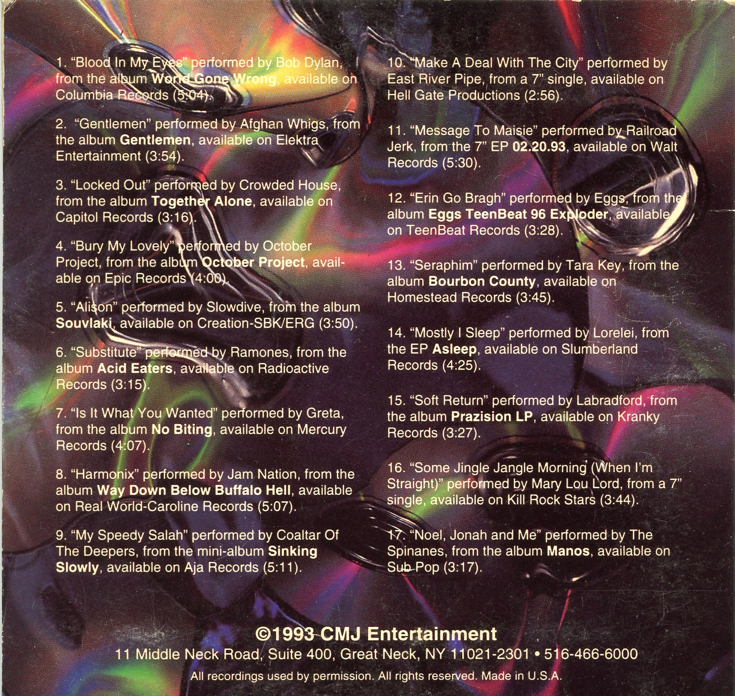 2) Bob Dylan – “Blood in My Eyes.” As I said above, CMJ focused primarily on newer acts, but veteran acts sometimes snuck onto the compilation CDs. This song hails from Dylan’s 1993 album World Gone Wrong.