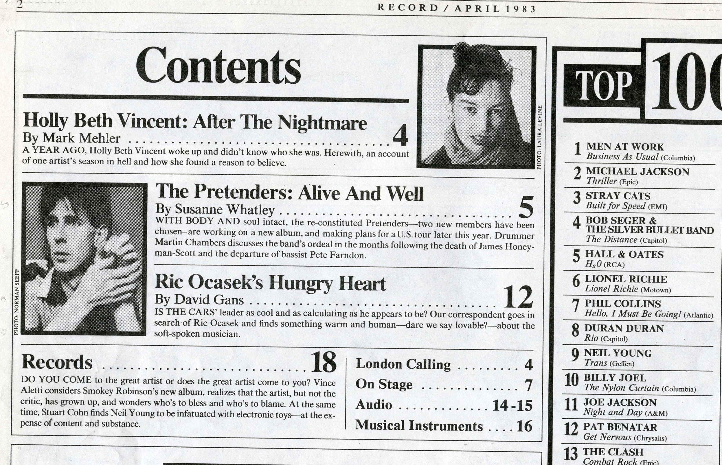 Ric Ocasek of the Cars, as evidenced by the picture up top, graces the cover. He’s the focus of an in-depth profile by David Gans that, as the Contents page reveals, uncovers the fact that the soft-spoken musician is warm, human and lovable. Who would’ve guessed?