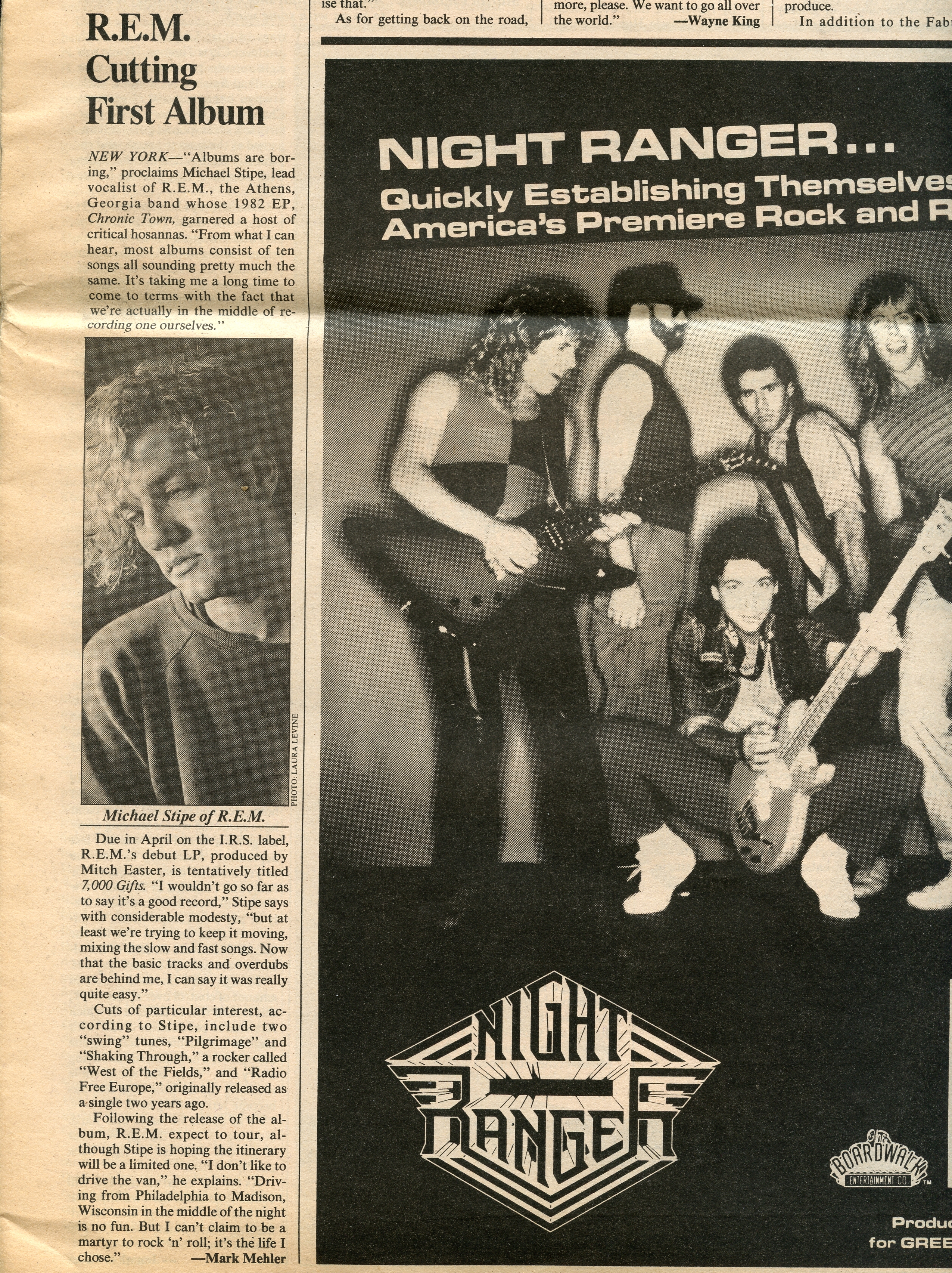2) R.E.M. – “Radio Free Europe.” Mehler also catches up with R.E.M.’s Michael Stipe, who discusses the recording of his band’s first album, then tentatively titled 7,000 Gifts. “From what I can hear,” he says, “most albums consist of ten songs all sounding pretty much the same. It’s taking me a long time to come to terms with the fact that we’re actually in the middle of recording one ourselves.” The brief piece concludes with Stipe discussing touring: “I don’t like to drive the van. Driving from Philadelphia to Madison, Wisconsin, in the middle of the night is no fun. But I can’t claim to be a martyr to rock ’n’ roll; it’s the life I chose.”