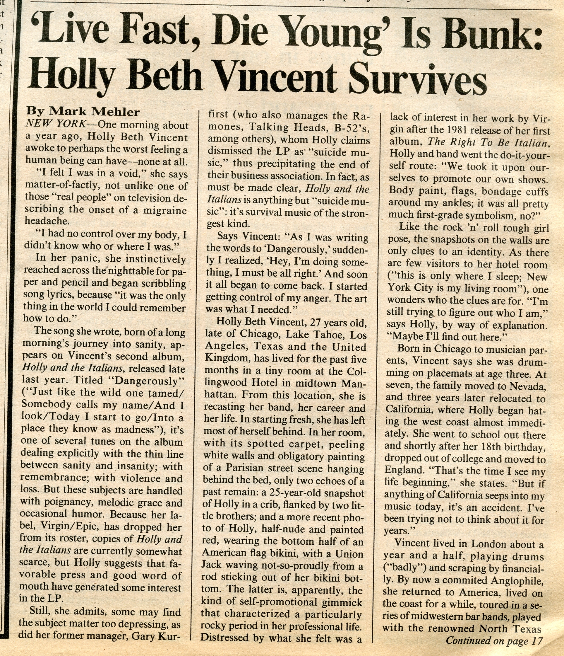 1) Holly & the Italians – “Dangerously.” Mark Mehler pens an excellent profile of Holly Beth Vincent, which opens with this: “One morning about a year ago, [she] awoke to perhaps the worst feeling a human being can have—none at all. ‘I felt like I was in a void,’ she says matter-of-factly, not unlike one of those ‘real people’ on television describing the onset of a migraine headache. ‘I had no control over my body. I didn’t know who or where I was.’”