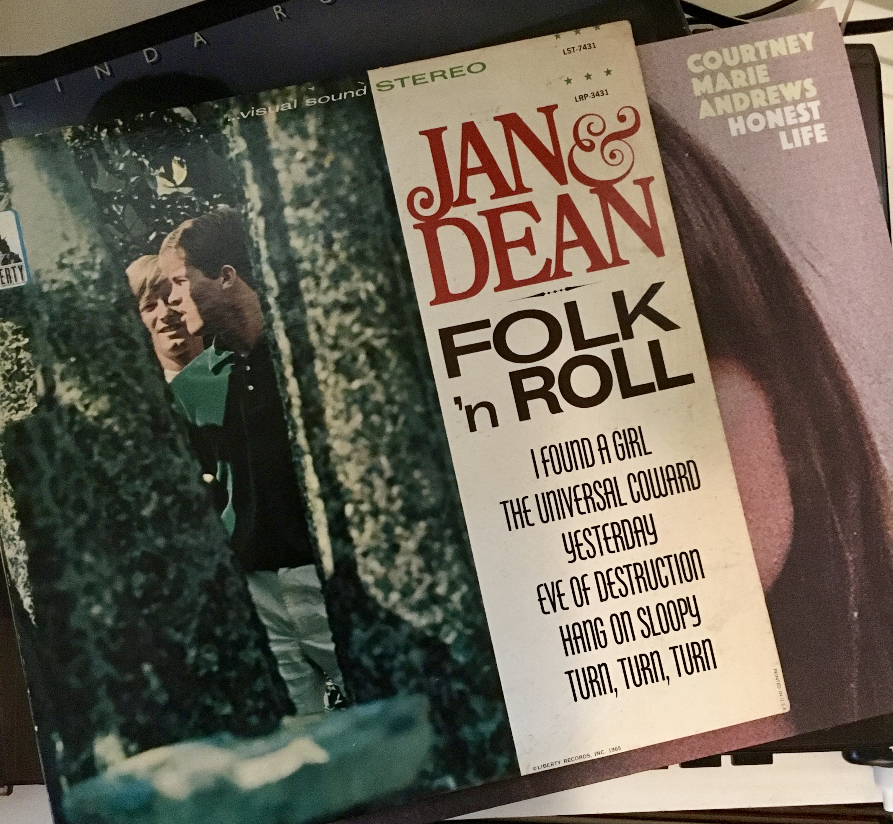 Fast forward a few more years, to the end of 1984: I’m browsing the used and rare vinyl in Memory Lane Records in Horsham and come across Early L.A., a compilation that featured pre-fame recordings by Dino Valenti, David Crosby, the Byrds and Canned Heat… and Jan & Dean’s 1965 LP Folk ’n Roll, which found the duo trading in their surfboards for fringed jackets.