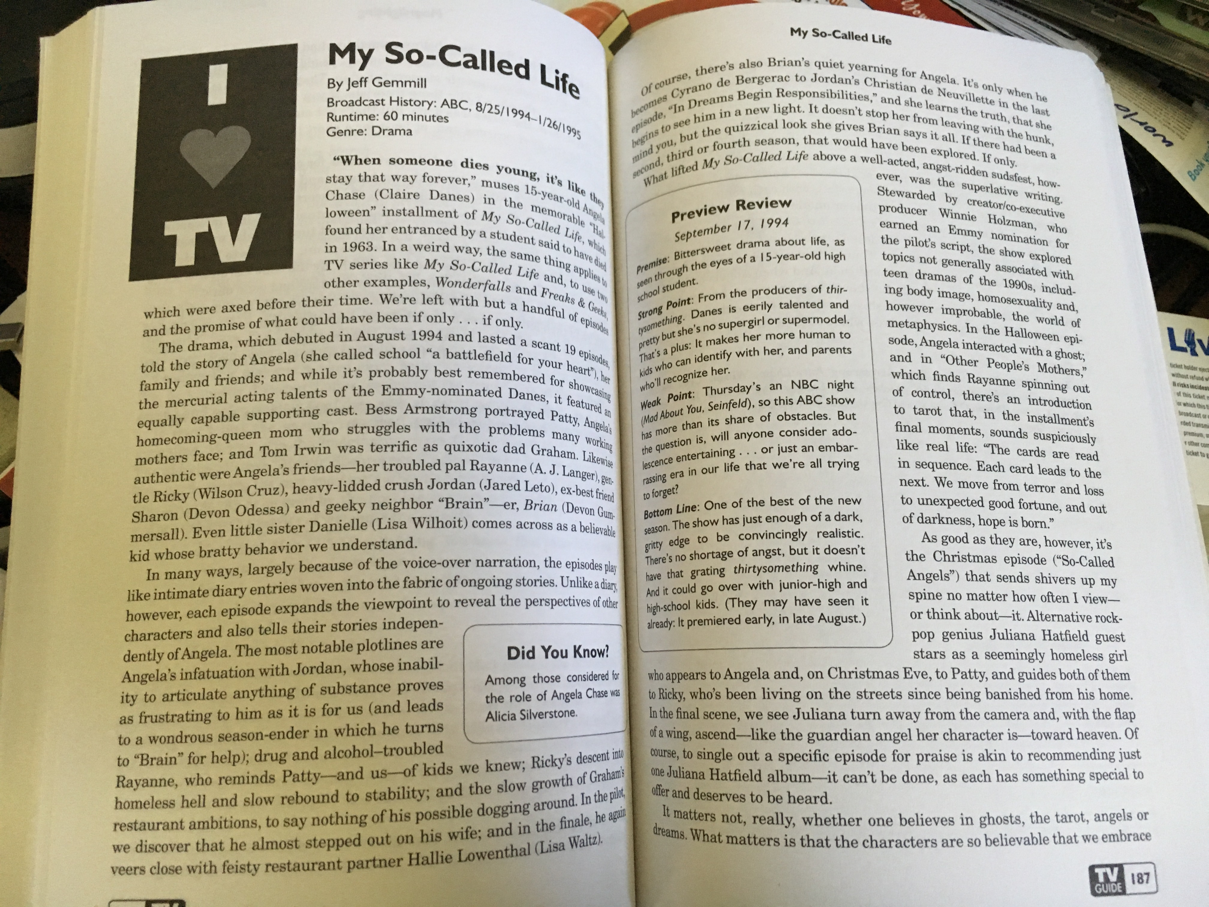 As long as I’m taking a gauzy walk down memory lane, here’s the first draft of another I Heart TV essay – my favorite of the contributions I made to the book. My So-Called Life was, is and will always be one of my all-time favorites, so being able to celebrate it in print…and mention Wonderfalls, Freaks & Geeks and Juliana Hatfield in the process?!…was something I truly cherished.