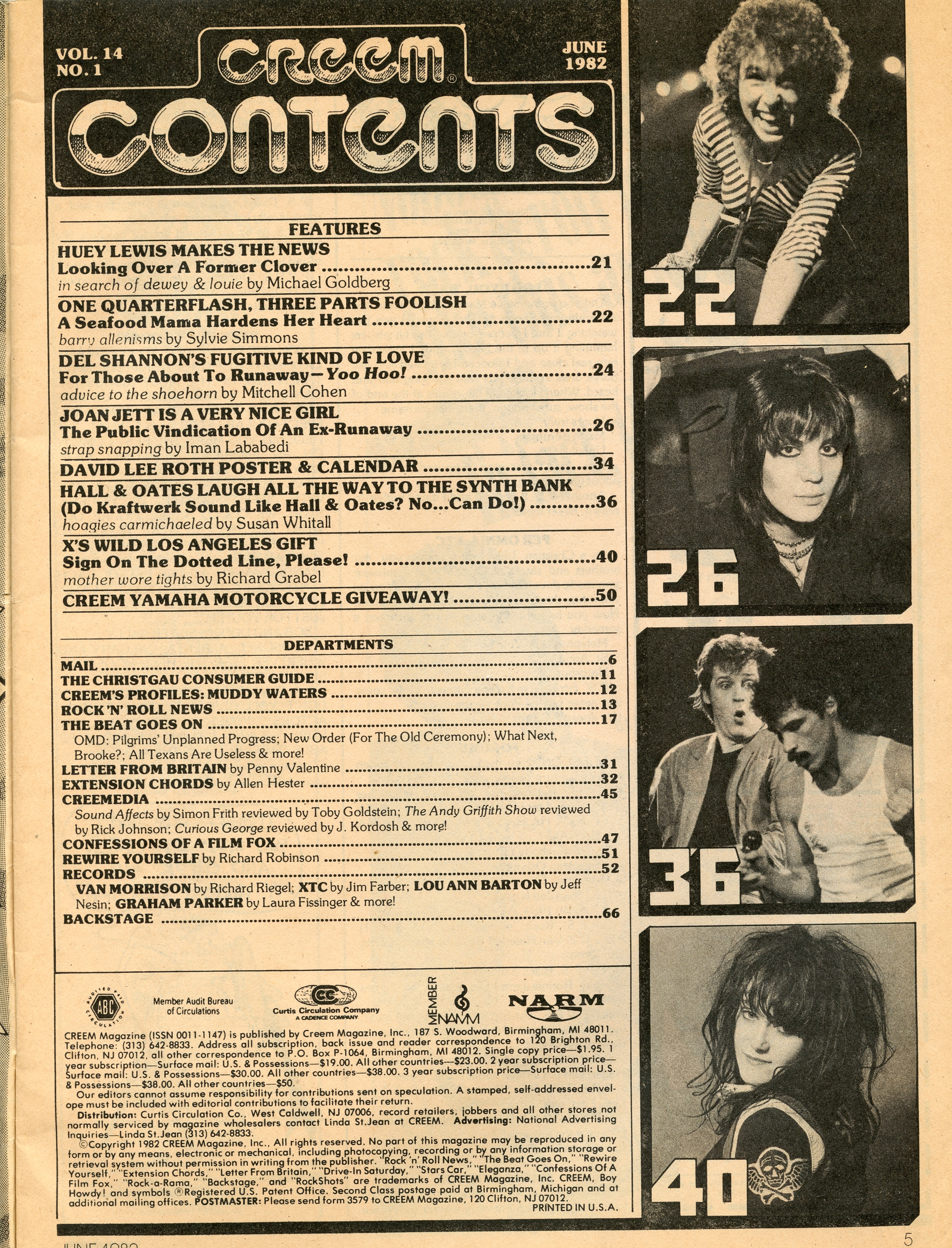 Which leads to today’s Top 5: June 1982 via Creem. Joan Jett graces the front cover of the issue and, via an ad, the back.