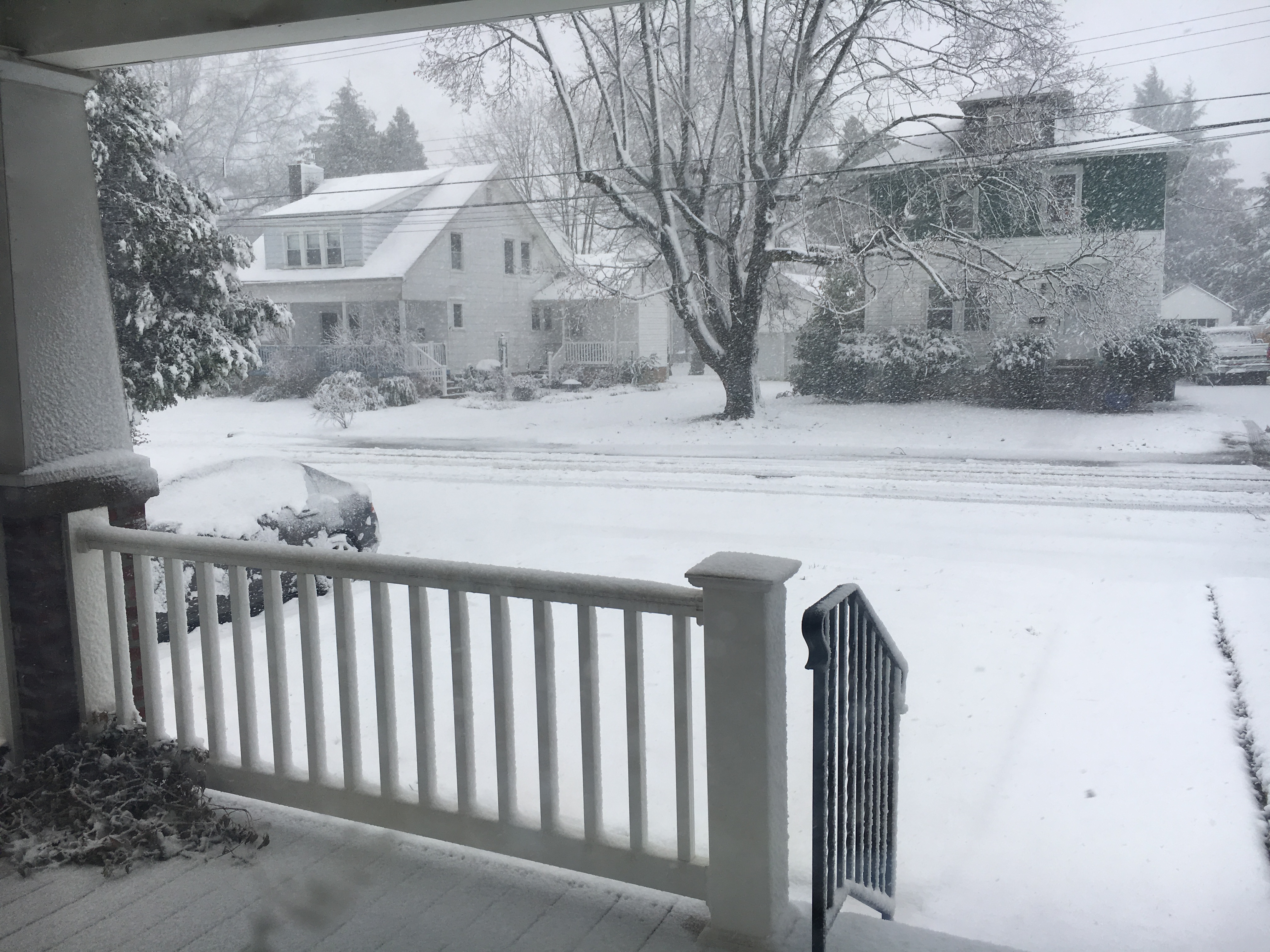 A nor’easter blew through the Philly region (and the Northeastern U.S.) yesterday. Among its other misdeeds: heavy rain, strong winds and blinding snow. It was the first two that caused me to work from home; the snow was something of a surprise, as the last weather map I saw showed my hometown on the borderline between receiving none and two-or-so inches. (And if the latter, said the same report, accumulations would mainly be on the grass.) So imagine my surprise when I opened the front door at 12:30pm and saw what appeared like a white blanket draped across the neighborhood.