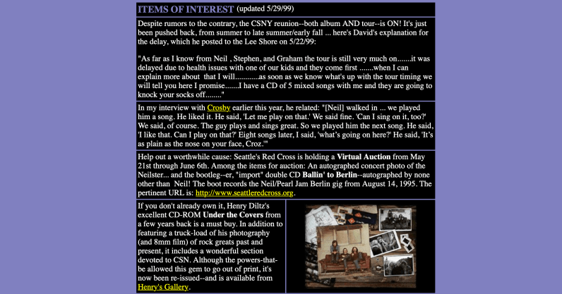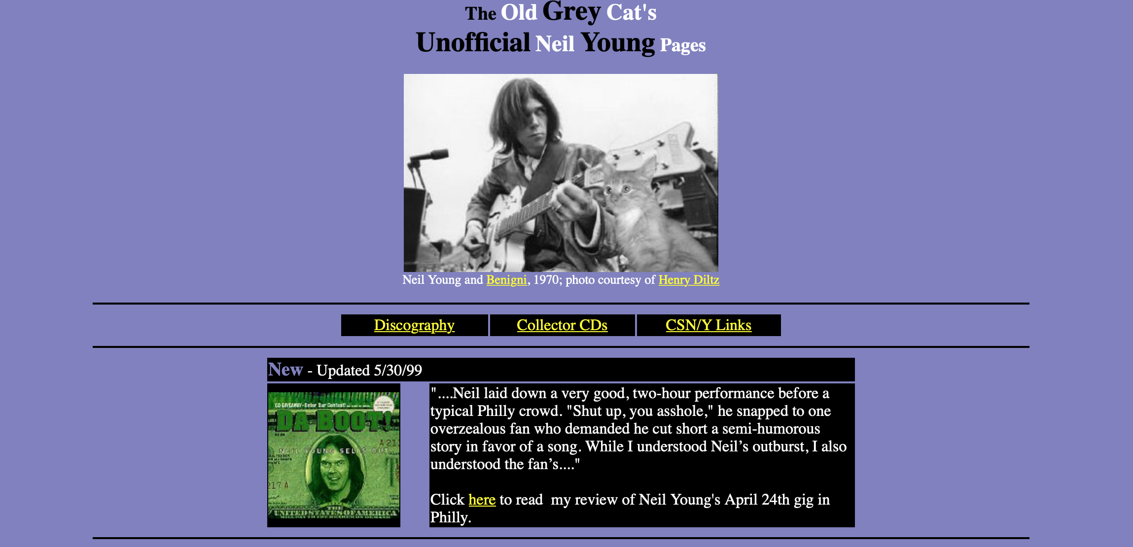 The original aim was to create an online encyclopedia of my and Diane’s favorites – and we each had sections and features on many artists, and even – via live365.com, which at the time offered dirt-cheap plans – a radio show, of sorts. But the primarily focus of the endeavor quickly became my “Unofficial Neil Young Pages,” which delved into the world of bootleg CDs.