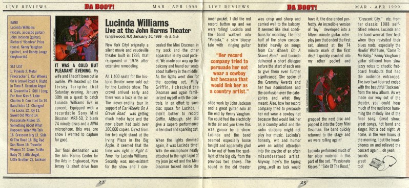 4) Lucinda Williams – “Right in Time.” When Diane and I saw Lucinda in June ’98 at the TLA, she arrived late due to, I think, fog – her afternoon flight was waylaid to New York, forcing her to hop a train to Philly, and then pray the audience didn’t grow restless and leave. The opening act, Jim Lauderdale, went on a little after nine; and she didn’t hit the stage until a little after 10. But despite her travel nightmare, and the delayed start, she still clocked in a two-hour show that was everything Bruce describes in this write-up of Lucinda’s January 1999 concert at the John Harms Theater in North Jersey.