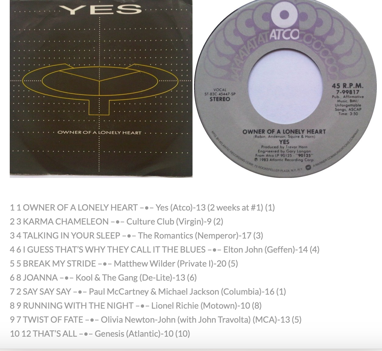 2) Van Halen – “Jump.” There’s no denying the utter joy of this single and its synth-driven riff, even if it was inspired by a man who was threatening to leap from the ledge of a downtown L.A. building. (“Go ahead and jump” was what Roth imagined people were yelling at him.) The group’s first and only No. 1 single was on its way to the top of the pop chart, rising in one fell swoop from No. 34 to No. 20.