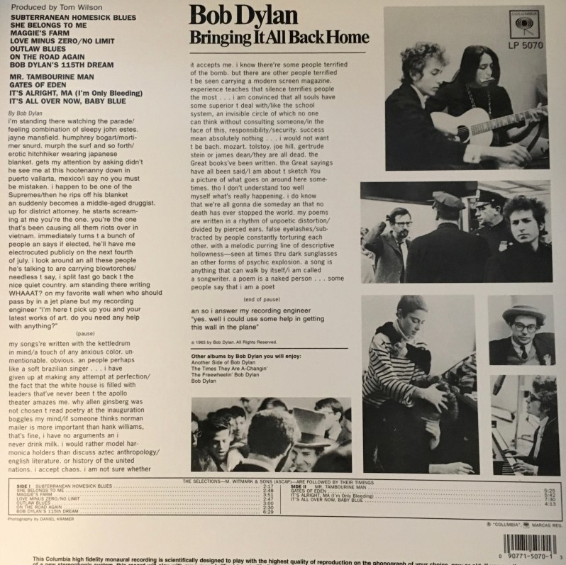 Of Bringing It All Back Home: The first side features Dylan backed by an electric band – a radical notion within the purist folk scene at the time. In the most simplistic description, the new sound marries the folk form to the rock beat.