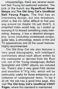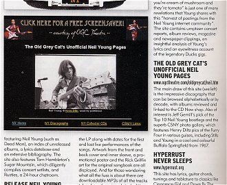 To give you an idea of what I mean: I created two mirrored versions of the same basic content: The Unofficial CSN/Y Pages and The Unofficial Neil Young Pages. By the time of the Y2K tour in 2000, the Neil pages were attracting 300+ unique visitors a day, the CSN/Y-branded pages about 50, and the rest of the site – en masse – maybe 25. As a result, my Neil pages – along with a few other NY-centric sites – were spotlighted in the short-lived Mojo Collectibles, which spelled my name wrong, and Record Collector.