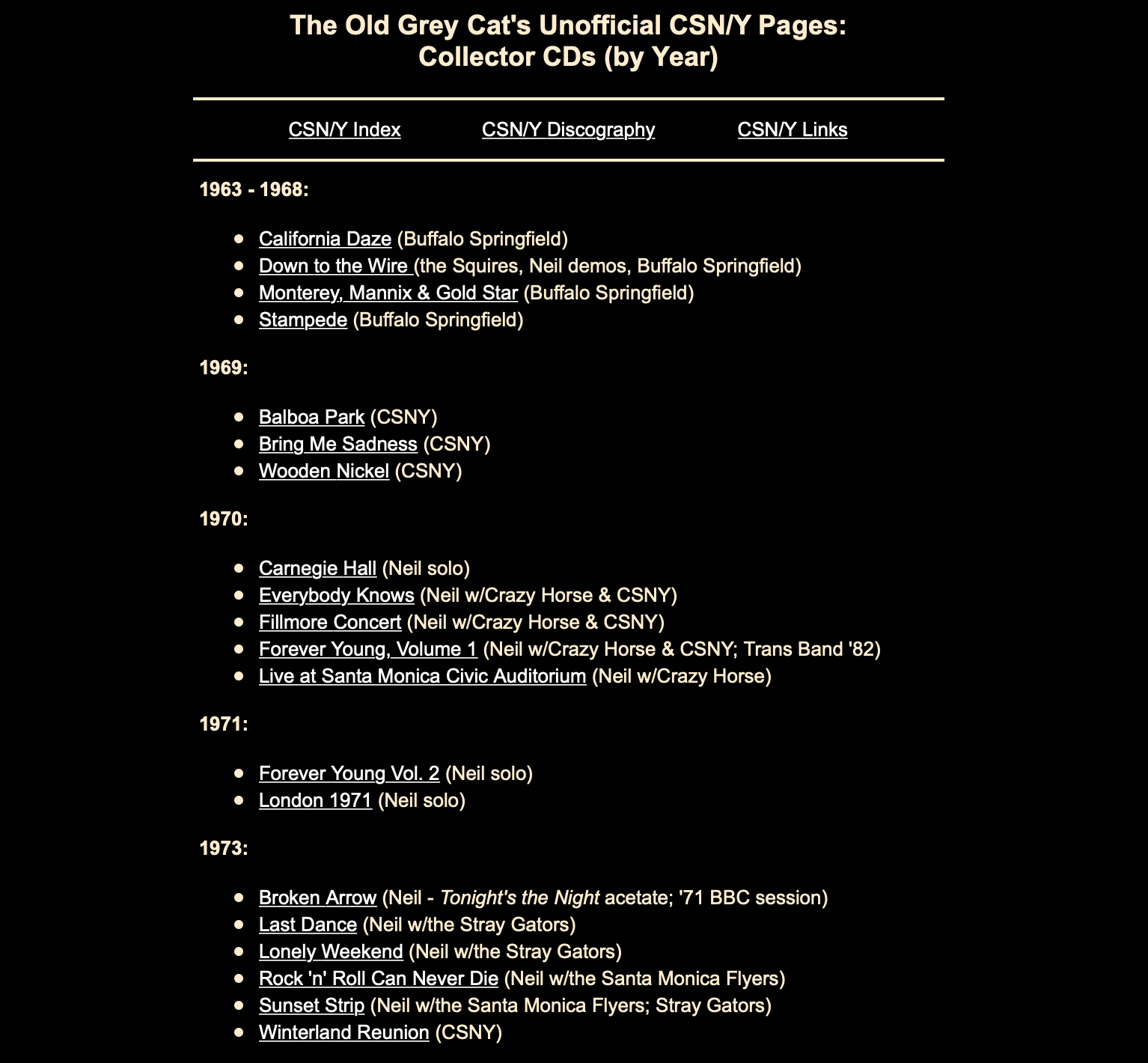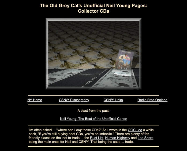 Mind you, folks weren’t visiting for my thorough album discography, which included useful links to CDnow. They were seeking information on bootlegs. Neil bootlegs, to be precise. And with the help of a handful of fellow (and metaphoric) longhairs, I delivered: The site was home to 100+ bootleg reviews. We dove deep into the music, sound quality and other esoteric stuff, and advised folks on what to look for and what to ignore.