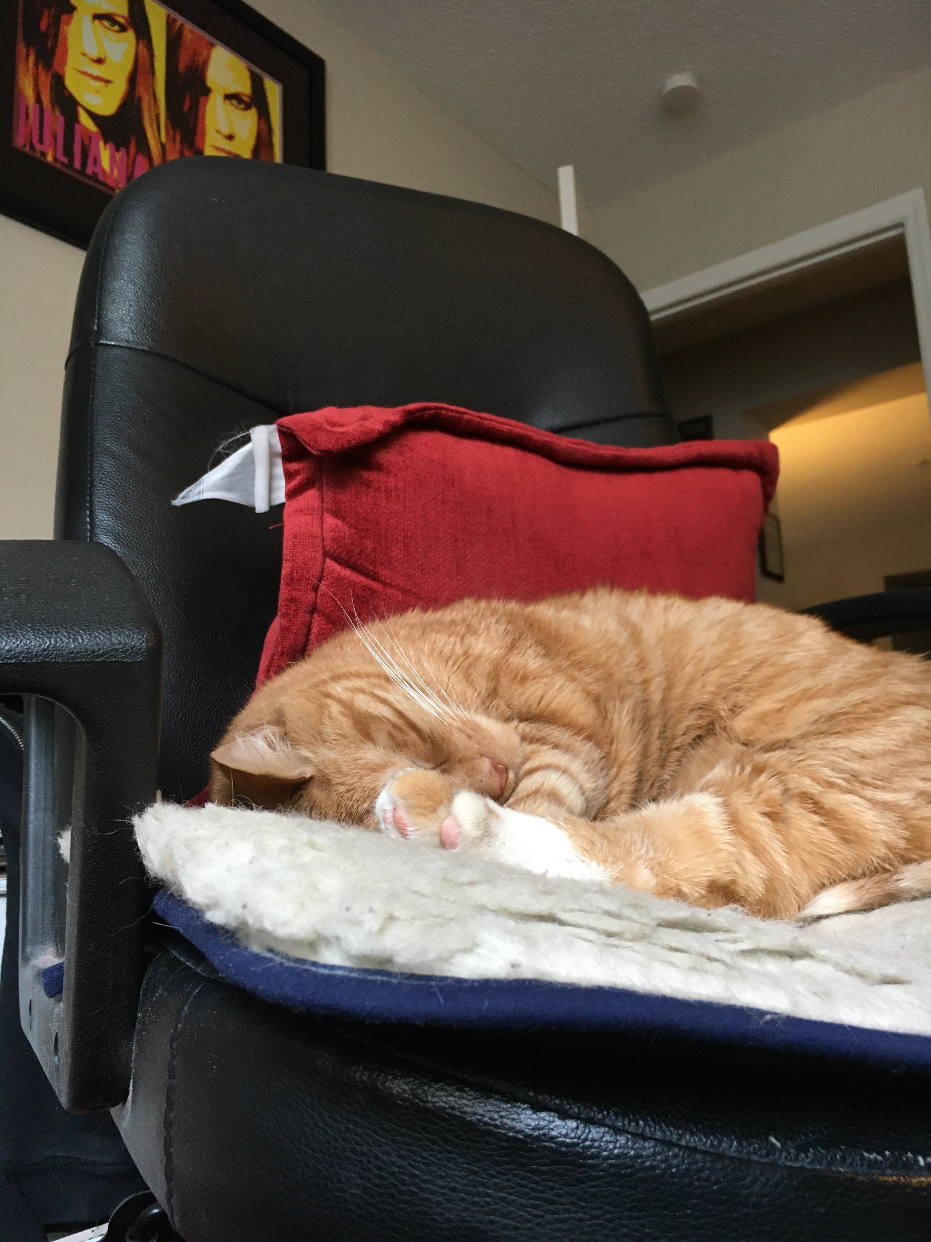 The results were near-miraculous: Within six months, his levels were in the normal range. The fluids were reduced to every other day. Now, 13 months later, he cajoles me into playing with him – or, as he did yesterday afternoon, tricks me out of my seat. After a day of working from home, I shut down the work laptop and fired up my MacBook Pro, and signed onto the Neil Young Archives to watch the Fireside Session – Neil performing a half-dozen songs for those of us self-isolating at present. Tyler poked his head up, batted me on the leg and seemed to want to play. But as soon as I got up, he jumped into the chair.