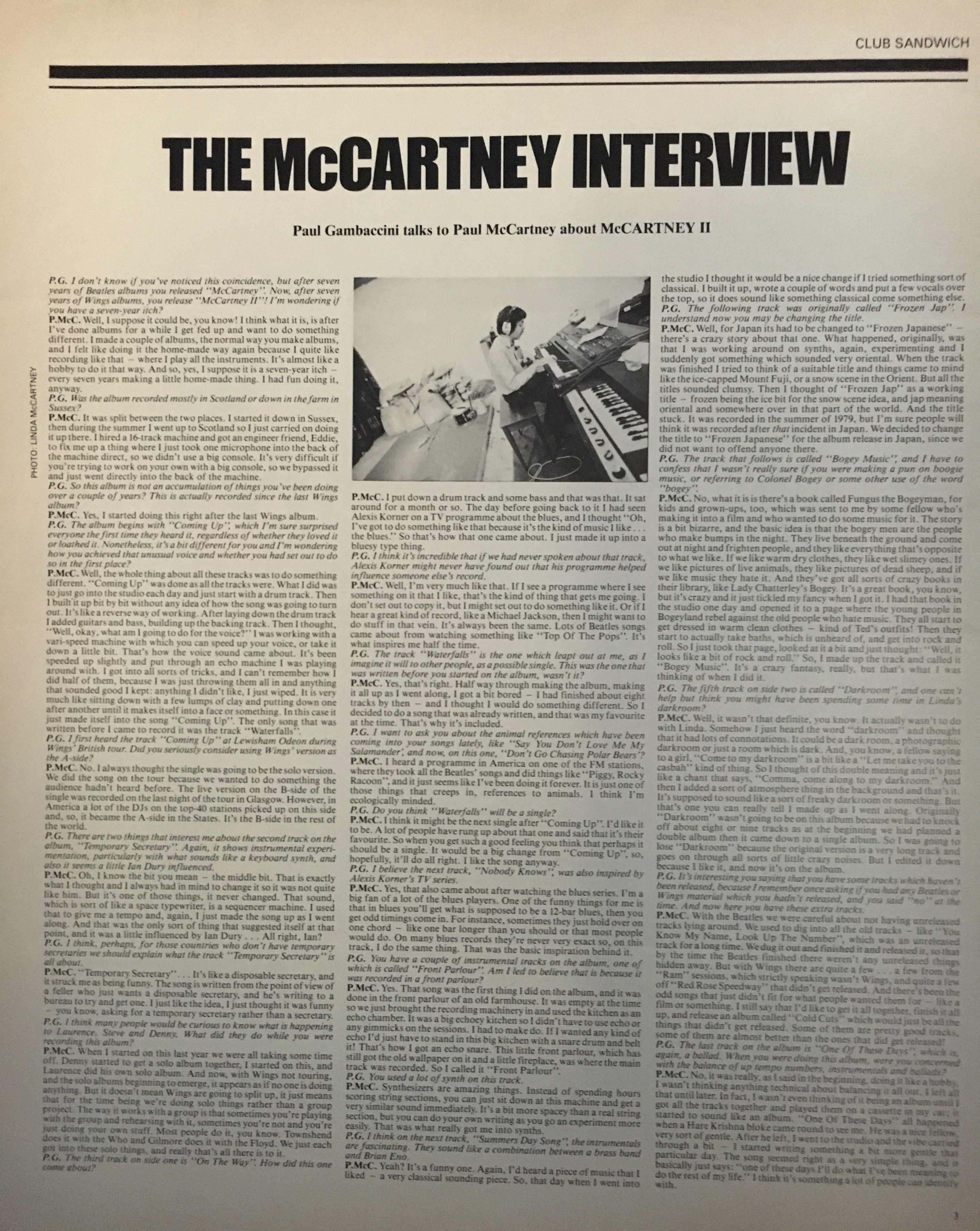 In Paul’s case, that meant goofing off – first in Sussex and then in Scotland. In a 1980 Club Sandwich interview with rock writer Paul Gambaccini, he says that “I hired a 16-track machine and got an engineer friend, Eddie, to fix me up a thing where I just took one microphone into the back of the machine direct, so we didn’t use a big console. It’s very difficult if you’re trying to work on your own with a big console, so we bypassed it and just went directly into the back of the machine.”