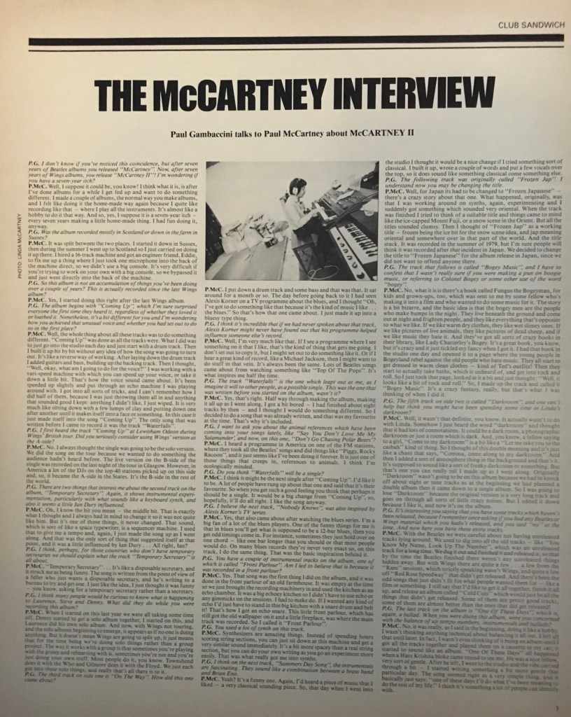 The plans to re-conquer the world were cancelled along with the sold-out 11-date Japanese tour; and McCartney found himself listening to his previous summer’s sonic adventures. From the same Club Sandwich interview with Gambaccini: “I wasn’t even thinking of it being an album until I got all the tracks together and played them on a cassette in my car; it started to sound like an album.” Then it became a matter of figuring out how to create a coherent set from the material. Paul, apparently, wanted to release everything as a double album, but then thought better – or, more likely, was reined in by his record company. Some songs were edited for length, while others were left behind.