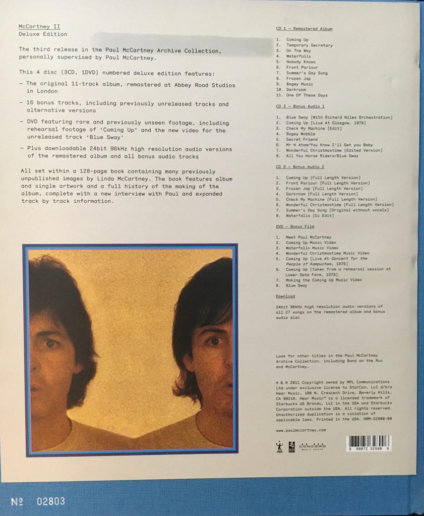 Anyway, in 2011, McCartney II was released alongside the original McCartney as part of the Paul McCartney Archive Collection (and can be heard on Apple Music). The set includes the unedited versions of many of the tracks as well as a few previously unreleased curiosities, such as the ambient “Blue Sway” (with Richard Niles orchestration) – a very cool track, that is – and the “Mr. H Atom/You Know I’ll Get You Baby” and “All You Horse Riders/Blue Sway.” Not everything jells, but that’s okay. They’re cool to hear, nonetheless.