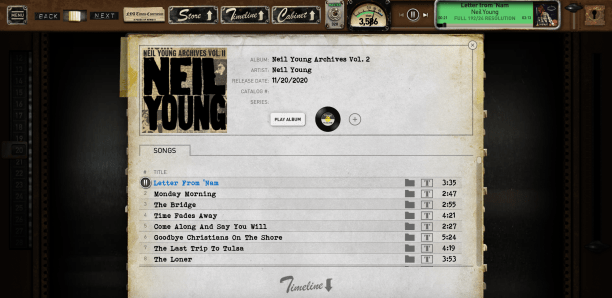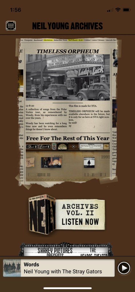 The online Archives, I should mention, is a tremendous value for both new and old fans. For those of us who, years long ago, traded tapes and CDRs on the Rust List or Human Highway email lists and/or browsed the bins of indie record stores in hopes of stumbling upon bootleg LPs and CDs…well, it’s (almost) all there. Every official release. Live sets. The first Archives box set and, now, Archives II. Plus, next year, bootlegs of bootlegs are slated to appear. And, if that’s not enough, there’s tons of video – Neil’s 1984 appearance on Austin City Limits, when he was backed by the International Harvesters, is currently available to watch. (For those curious, it’s free for the holidays – and even when it’s not…it’s only $19.99/year.)