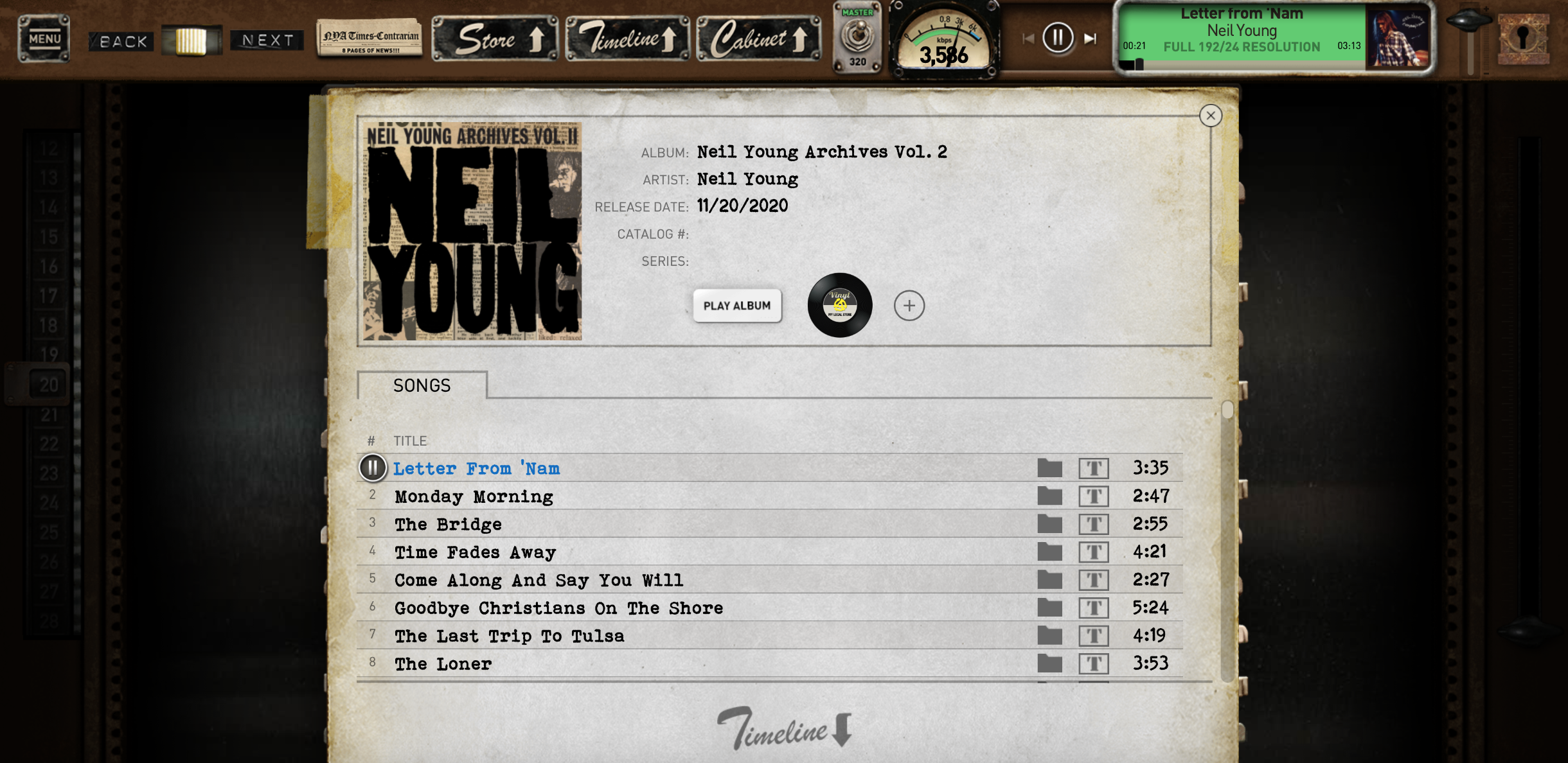 The original deluxe edition, which was limited to 3000 copies, sold out in a matter of hours despite its mammoth price of $249.98. A second run is now scheduled, with a release date of next March, as is a “retail edition” with a reduced price of $159.98. (The Greedy Hand store is aptly named.) Me, I’ll likely buy the set as high-resolution downloads…and, until then, enjoy it via the Neil Young Archives website and iPhone app.