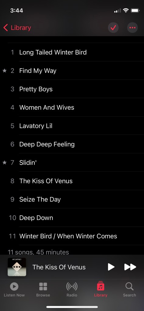 My third reaction: A week before Christmas and all through the house, only a cat was stirring in hopes of not catching a mouse, but eating breakfast before dawn. That meant a slap to his dad’s head to cajole him out of bed and then a few nips on his heels while he prepared said meal. Which is to say, whimsy works wonders when not overdone – and such is the case with III. There’s plenty of McCartney’s patented homilies to heart, hearth and home, in other words, plus philosophical musings, but schmaltz is nowhere to be heard. In “Seize the Day,” for instance, he confesses that, “I bless the day when you came into my life/And I could finally roll back the blind/You helped me to realize that love was the greatest prize/I only had to open my mind…”