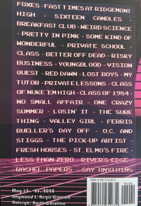 I share that because of this: Risky Business is one of eight films (actually, seven and a half) I’ve seen that are featured in Obscurion Presents ‘80s Teen Flicks Festival Guide Book, written by Joseph Corey III to accompany a canceled 2020 film festival in Raleigh, NC. Although he likes the Tom Cruise movie more than me, he uses the essay as a springboard to explore the corporate embrace of contract employees. I.e., he often expands his focus to more than just the films themselves so, even if you haven’t seen them, the essays are still interesting.