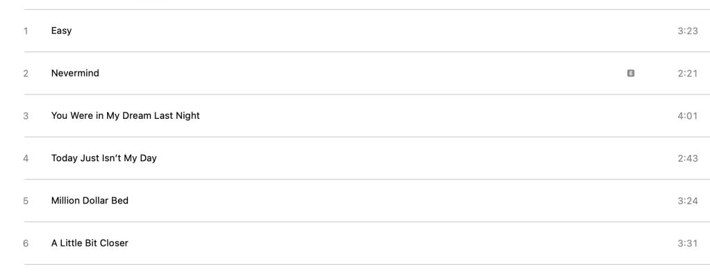 “Million Dollar Bed,” on the other hand, initially sent me skipping like a stone along the memory banks of my mind in search of what the chorus reminded me of – and, half a day later, bam! It hit me. It’s Wham’s “Last Christmas.” (I was never into George Michael’s music, so I’m sure it took me longer than it would others.) Play the two back-to-back and you’ll never un-hear the similarity. I assume it’s an intentional tip of the hat, but even if it’s not… it’s cool all the same.
