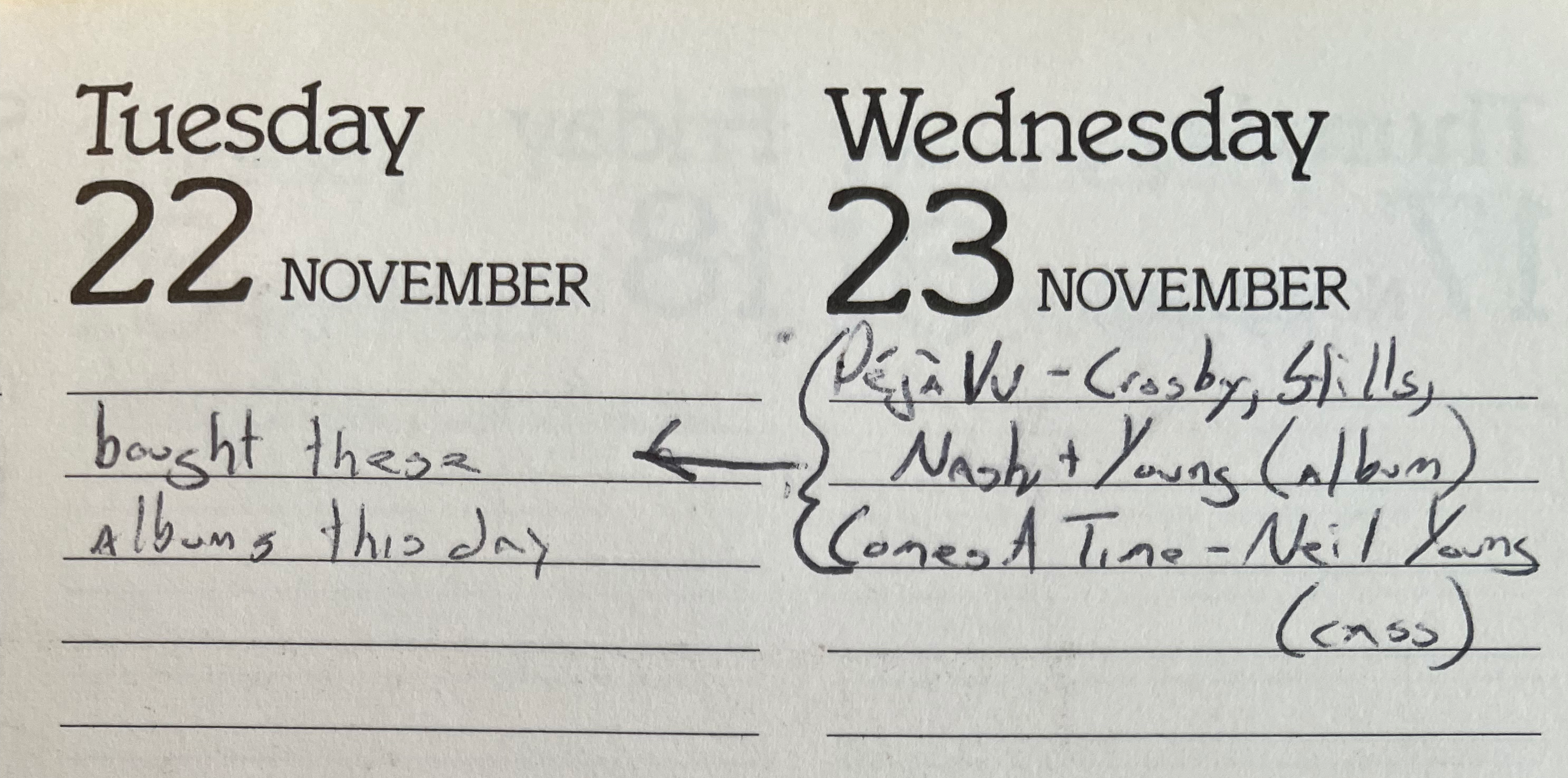 I have a mixed take on it, as well, part of which I chalk up to my age. I first heard it in full on Nov. 22, 1983, in a back-to-back bacchanal with Neil Young’s Comes a Time – I can say so with certainty thanks to my desk calendar. I was 18, I should mention, and a Neil fan. Unlike other albums of its era, Déjà Vu sounded anachronistic to me – fine nostalgia fodder for those of a certain age, but a faded snapshot of days long past for everyone else.