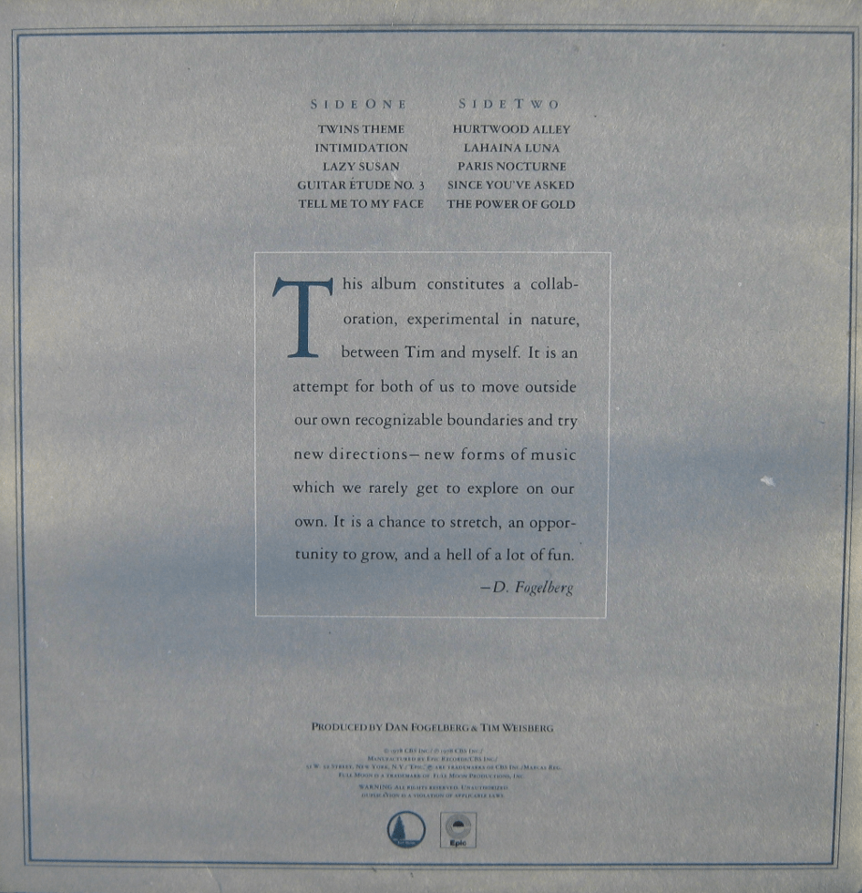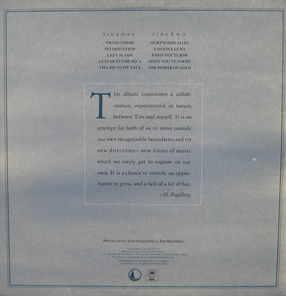 They’d long been admirers of each other, it should be noted, with Weisberg adding his distinctive flute to “Give Me Some Time” on Nether Lands. It was then, from what I’ve read, that Fogelberg glommed onto the notion that they should join together for an album-long endeavor. Perhaps to set the stage for it, he had the flautist join him on some stops of his otherwise solo fall tour. Recording commenced in early 1978.