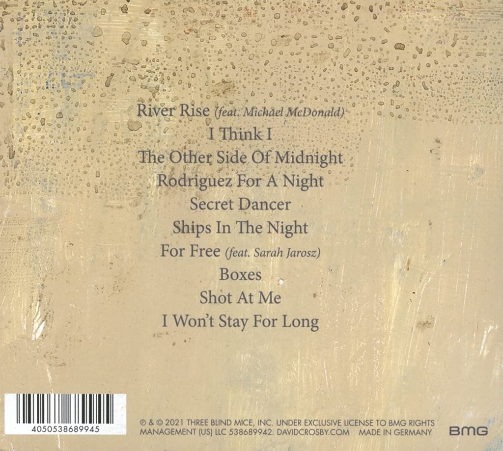 The album opens with “River Rise,” which finds Crosby accompanied just by a piano at its start. “It’s late in California,” he sings. “The voices are speaking low/and the wheels line up/point the direction they wanna go…” A wind gusts through the song, in a sense, and brings with it a sonic shift some 30 seconds in, when Michael McDonald’s backing vocals kick in much as they did for Steely Dan back in the day. The overall result is in sync with the sophisticated rock of Mssrs. Fagen and Becker and not the thoughtful folk-rock he cultivated with erstwhile partners Stephen Stills and Graham Nash – or what he and Nash achieved with the Mighty Jitters.