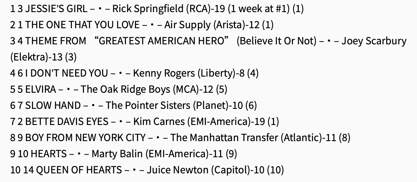 1) The Greg Kihn Band – “The Breakup Song (They Don’t Write Them).” Kihn had been kicking around for much of the previous decade, forming the Greg Kihn Band in 1976 and releasing his first album the same year. This addictive single, which clocks in at No. 27 after 11 weeks on the charts, hails from the 1981 Rockihnroll LP and would eventually stutter-step its way to No. 15. Incidentally, the band never recorded a video for this song because…well, why? Pre-MTV, such things were a luxury, not a necessity. As a result, the below clip is representative of the era as much as any other: A rock band appearing on one of the few TV shows that would have them: Dance Fever. (So, at least for this video, dub them the Greg Kitsch Band….)