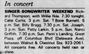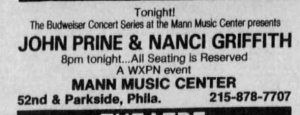 Suffice it to say, we saw Nanci just about every time she played Philly after that, including the early and late shows she did with Mary Chapin Carpenter and Beth Nielsen Chapman at the TLA in 1991. Other memorable concerts occurred in 1992, when she headlined the last night of what I believe was WXPN’s inaugural (and free!) Singer-Songwriter Weekend at Penn’s Landing, and her twin-spin with John Prine at the Mann Music Center in 1993.
