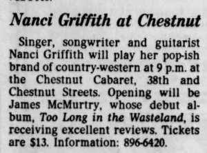 Although Nanci played the Chestnut Cabaret a few months later, I didn’t see her in concert for the first time until that October, when she played the same venue with James McMurtry opening. It was a great night that I’ve documented before, so won’t do so again.