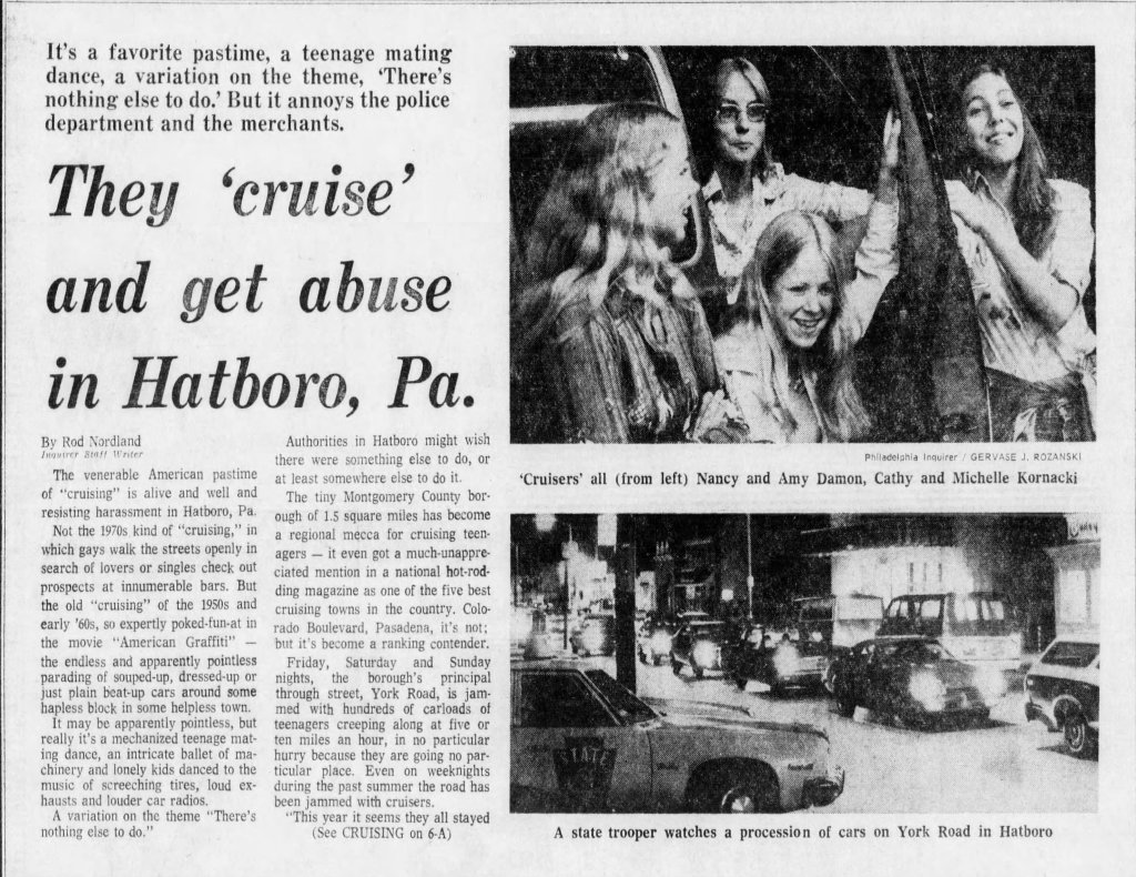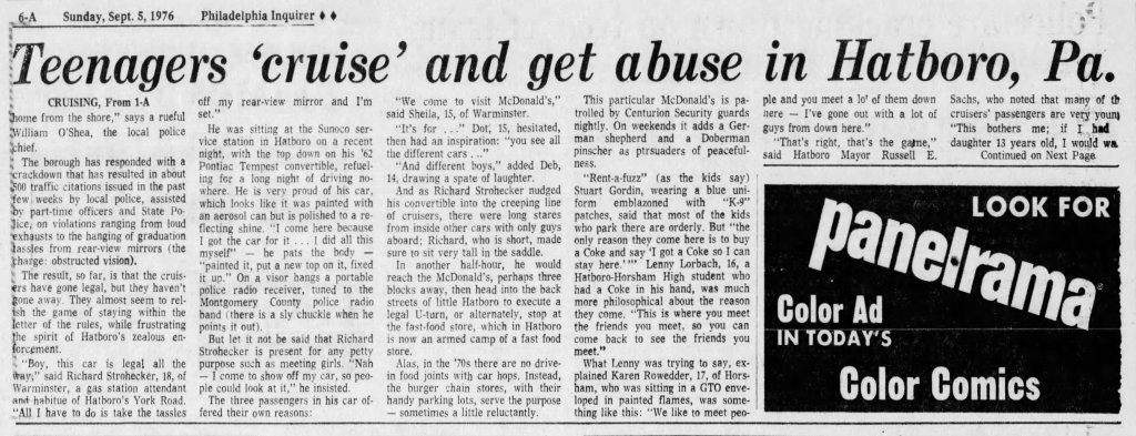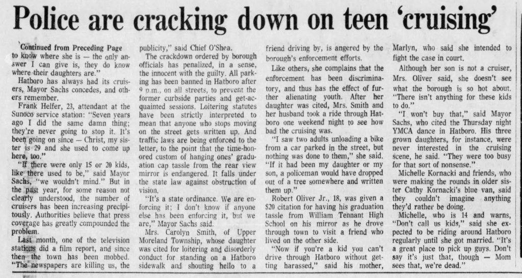 In any event, I was 11. The music bug had yet to bite. So, this night, I likely scanned those sections of the 429-page Sunday Inquirer that interested me, aka the comics, sports and entertainment, while watching TV and/or devouring a magazine I picked up during the earlier jaunt to Burdick’s – a wrestling rag, no doubt. Which means I missed this front page story of the borough cracking down on teens who cruised main street most weekends: